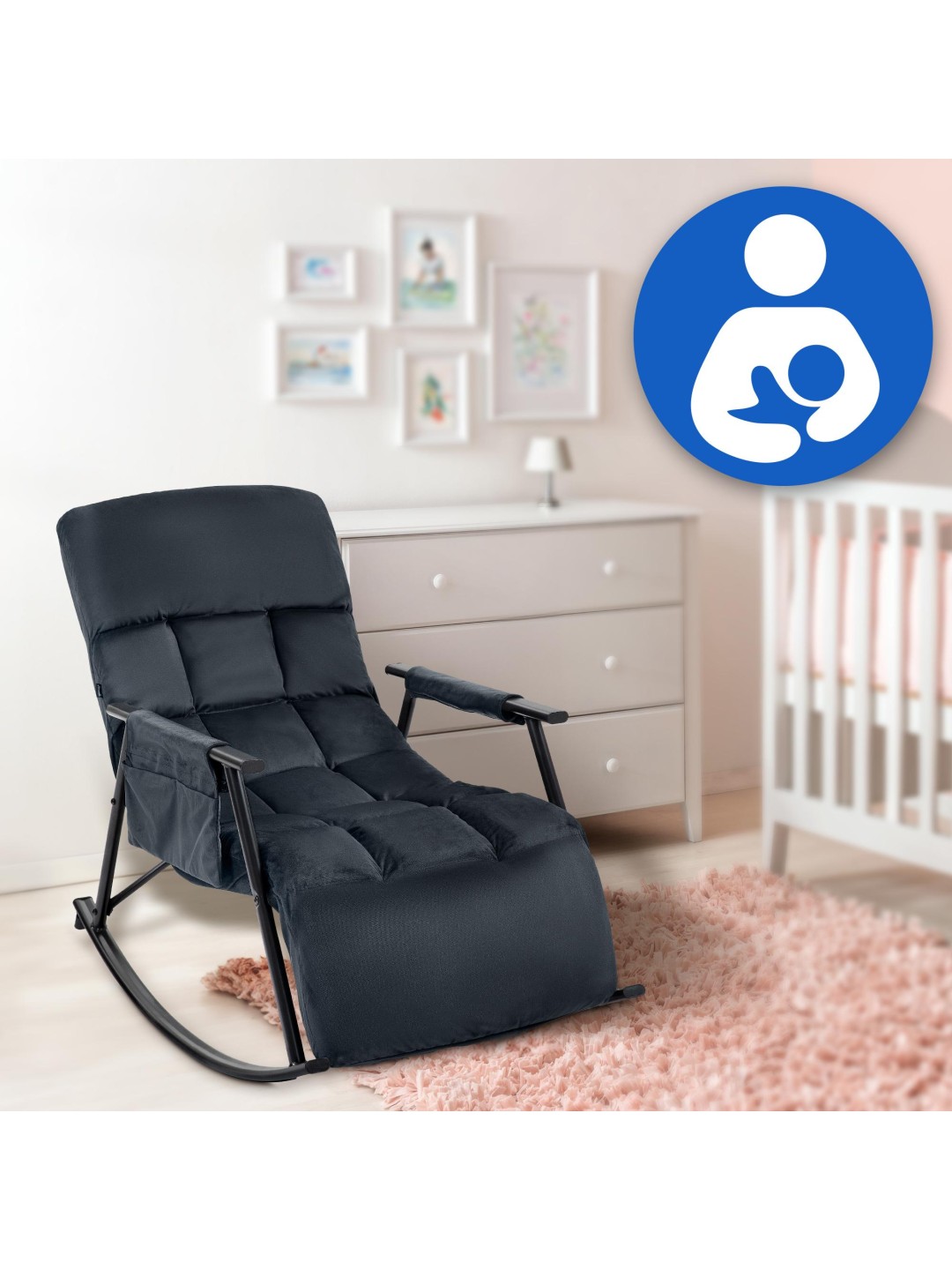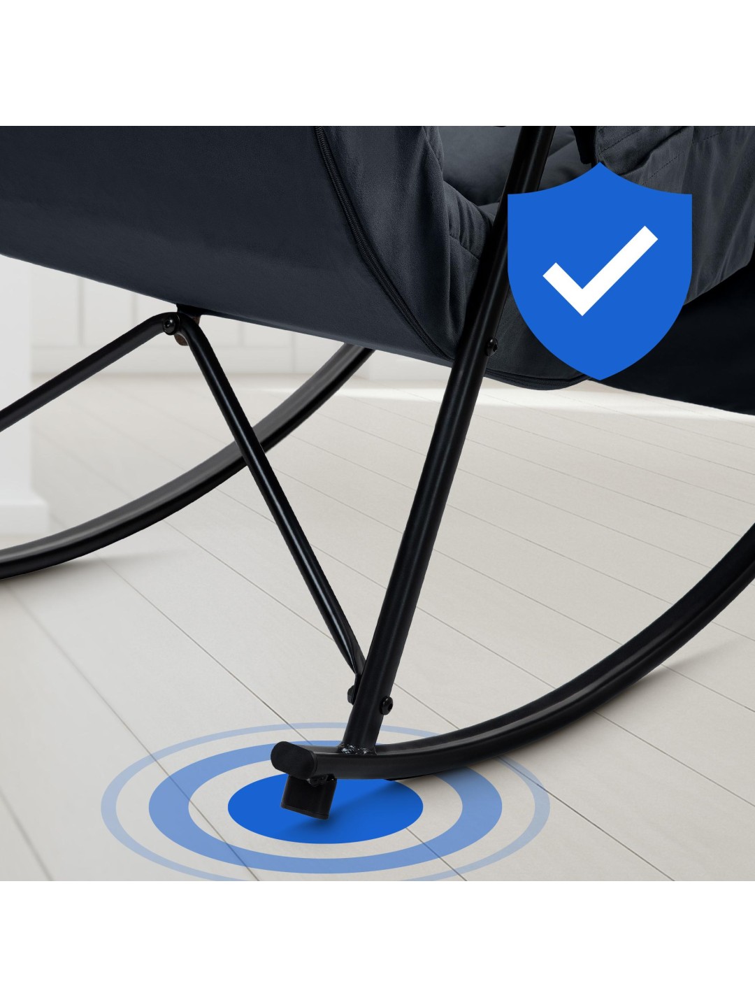 Betrækket med et moderigtigt quiltet mønster fås med enten stof eller fløjlsbetræk. Stellet i pulverlakeret metal bidrager til det moderne look, men også til den høje stabilitet. Gyngestolen kan sikkert belastes med op til 125 kilo.