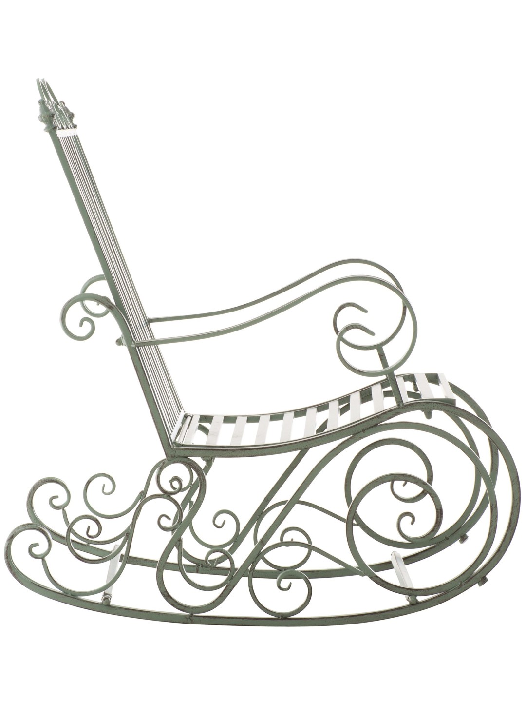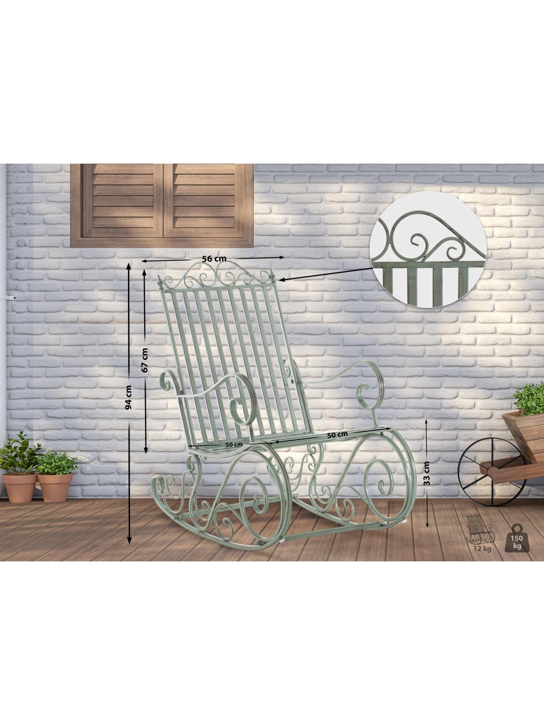 Afslapningsstolen kan bruges på terrassen, i haven eller endda indendørs. Gyngestolen er lavet af malet jern. Jernstolen er nem at passe og kan rengøres med en fugtig klud og mildt rengøringsmiddel. Overfladen på havestolen er afsluttet med en smuk patina, der matcher de smukke dekorationer. Havestolen bør beskyttes mod direkte vejrpåvirkninger.