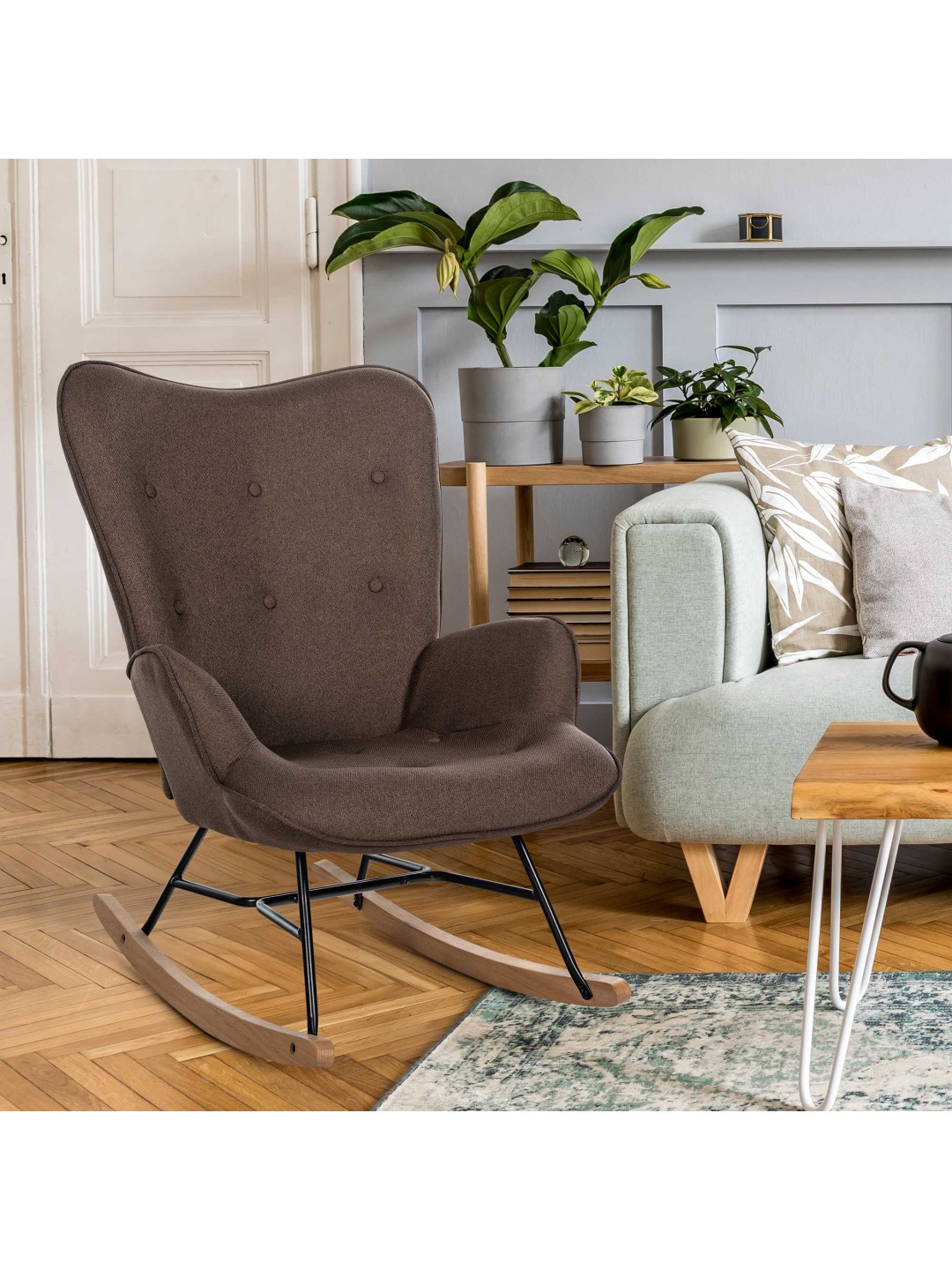Sanka gyngestolen er et behageligt, solidt og samtidig stilfuldt sæde til hverdagsbrug. Det moderne møbel passer perfekt ind i næsten enhver stuestemning. Den komfortabelt polstrede sædeskal med stofbetræk lover behagelig siddekomfort. Knapperne på rygpuden tilføjer moderigtige accenter. De elegant formede løbere i bøgetræ er skruet fast på et sortmalet metalstel af høj kvalitet, som giver stolen dens høje stabilitet. Et alsidigt smukt møbel, som du vil have glæde af i lang tid!