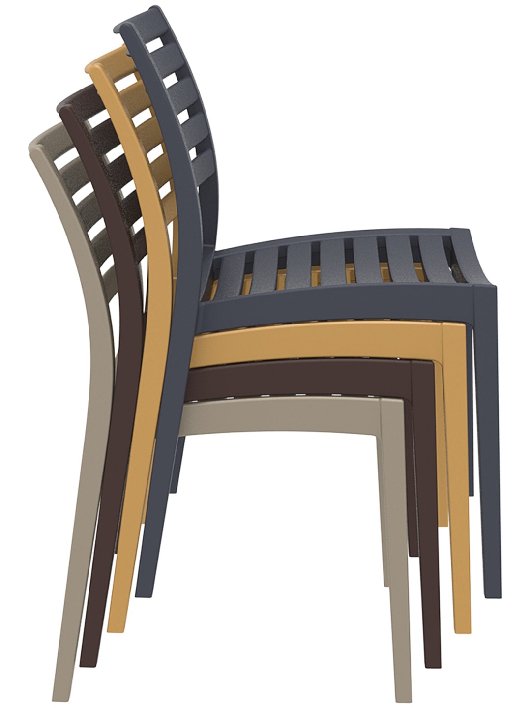 Ares havestolen er lavet af vejrbestandig plast af høj kvalitet. Den klipper en god figur ikke kun indendørs, men også udendørs såsom terrassen eller altanen. De anvendte materialer gør den også UV-bestandig. Selv hyppigt og intenst sollys får ikke plastikken til at gulne eller falme. Stolenes farvedybde bevares i lang tid.