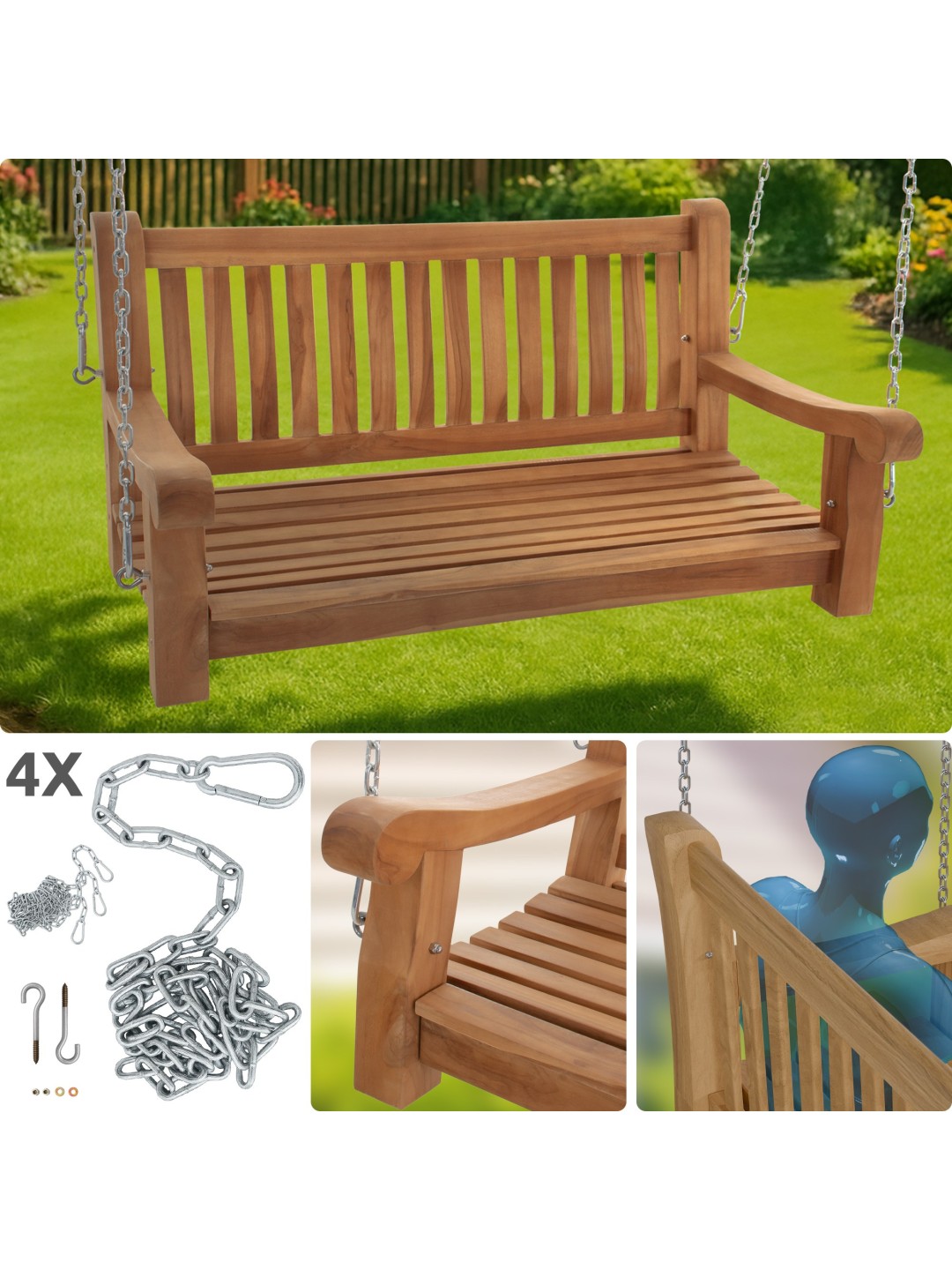 Havegyngen ser smart ud med sit enkle ydre og teaktræets gyldenbrune farve og kan kombineres med en række forskellige indretningsstile. Bænken er ideel til afslapning. Siddeområdet er let buet, så bænken er behagelig selv uden polstring. Teakbænken er desuden udstyret med armlæn på siderne.