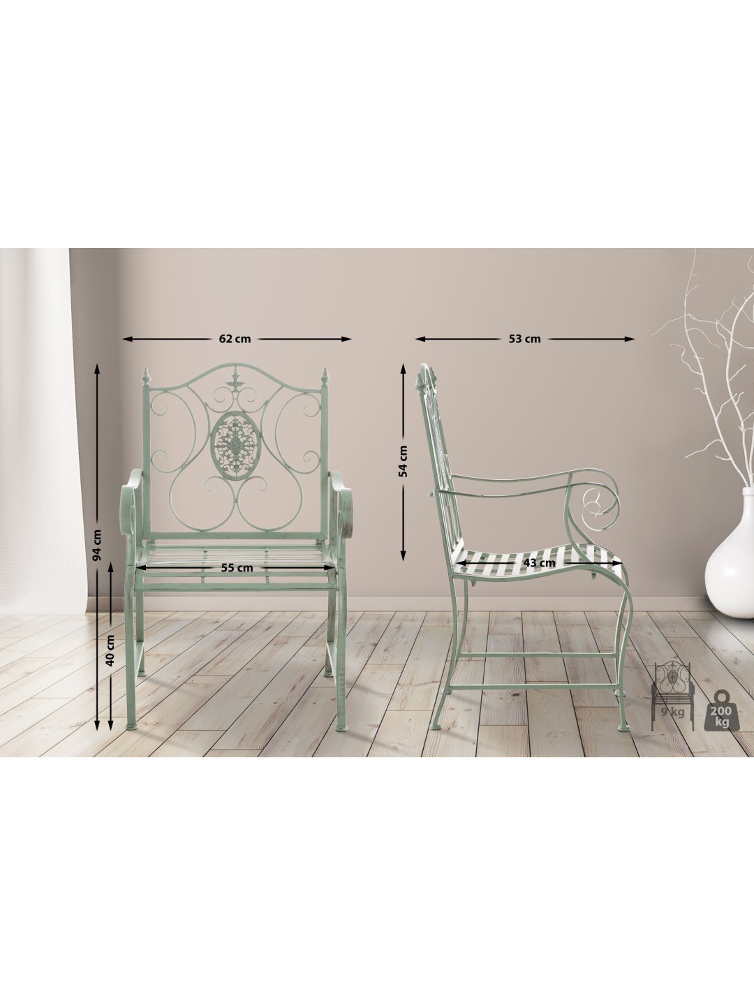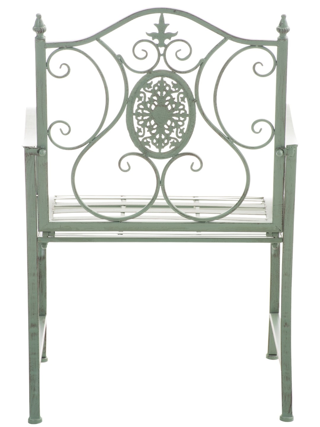 Stolen er lavet af malet jern. Jernstolen er nem at passe og kan rengøres med en fugtig klud og mildt rengøringsmiddel. Overfladen på havestolen er afsluttet med en smuk patina, der matcher de smukke dekorationer. Havestolen bør beskyttes mod direkte vejrpåvirkninger.