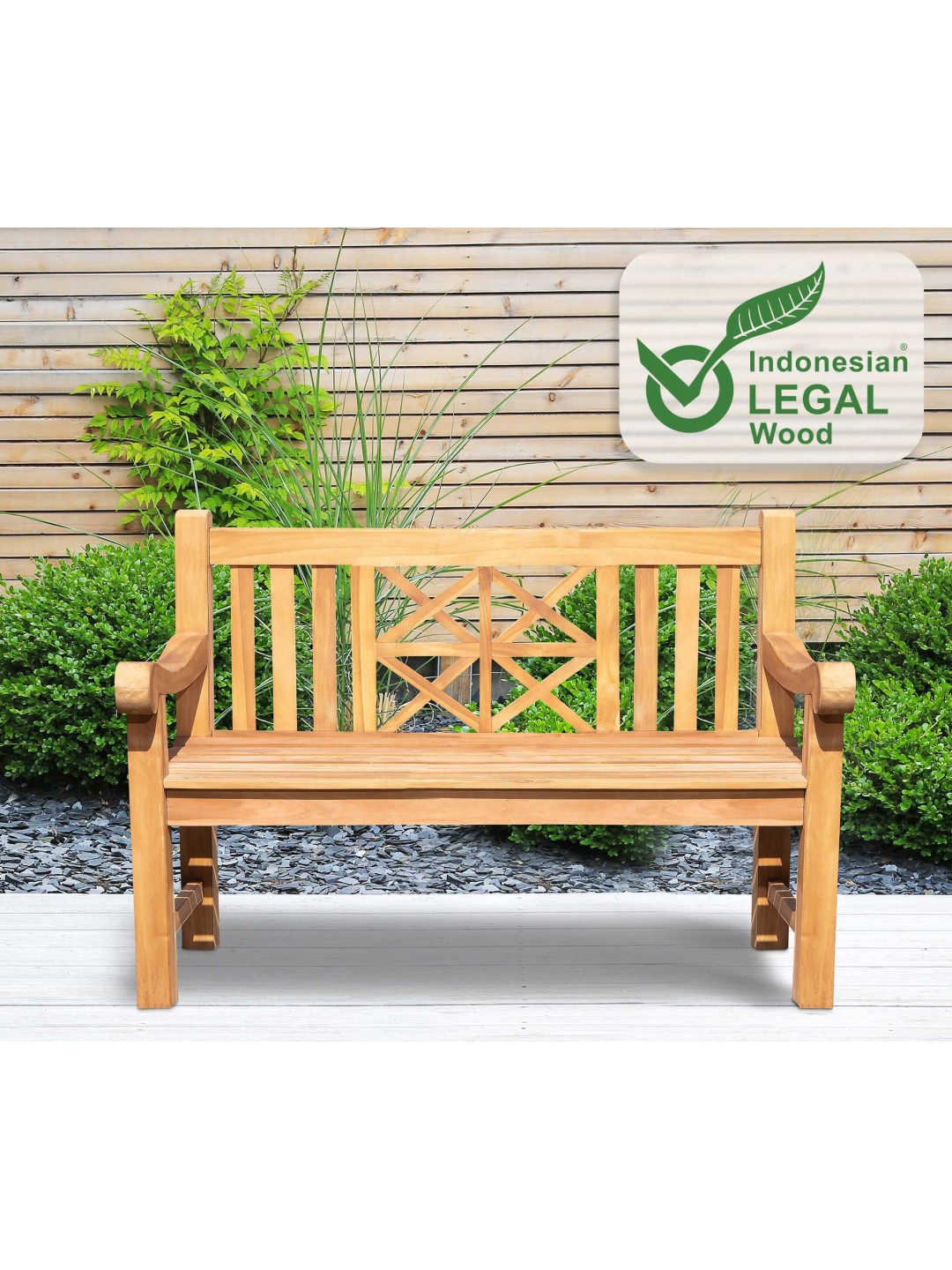 Sådan en solid bænk lavet af massiv teaktræ hører simpelthen hjemme i enhver have. Med sit tidløse trindesign passer denne havebænk perfekt ind i billedet overalt og kan også harmonisk kombineres med eksisterende terrasse- eller havemøbler. Det let buede sæde, det behageligt skrå ryglæn og de buede armlæn giver teakbænken en ergonomisk siddekomfort. Staldbenene er lavet af 7x7 cm tykke massive træplanker.