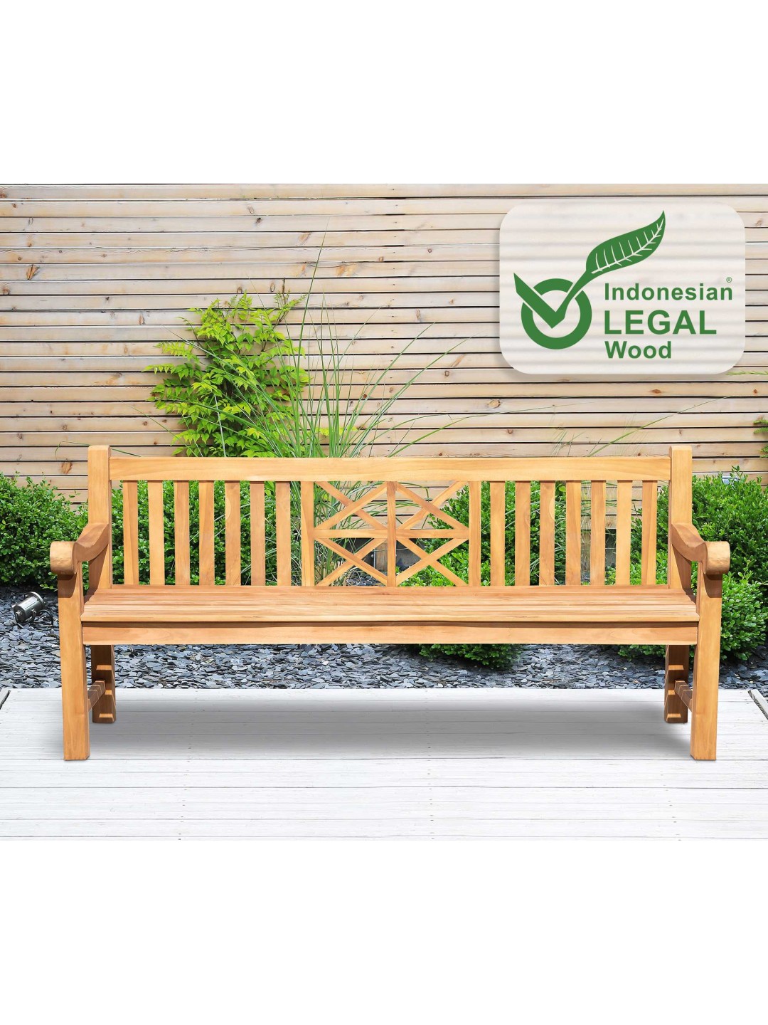 Sådan en solid bænk lavet af massiv teaktræ hører simpelthen hjemme i enhver have. Med sit tidløse trindesign passer denne havebænk perfekt ind i billedet overalt og kan også harmonisk kombineres med eksisterende terrasse- eller havemøbler. Det let buede sæde, det behageligt skrå ryglæn og de buede armlæn giver teakbænken en ergonomisk siddekomfort. Staldbenene er lavet af 7x7 cm tykke massive træplanker.