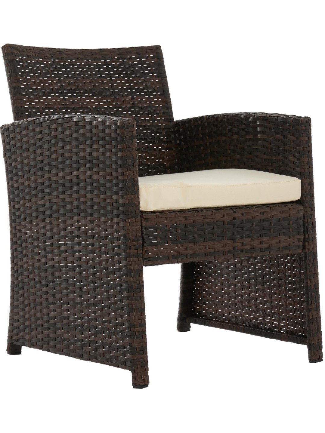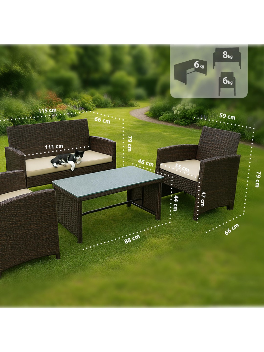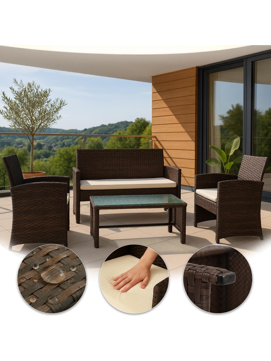 Havemøbelsættet består af to lænestole, en sofa til to personer og et havebord med glasplade. Komfortable sædehynder er også inkluderet i sættet og øger siddekomforten sammen med ryglænene.