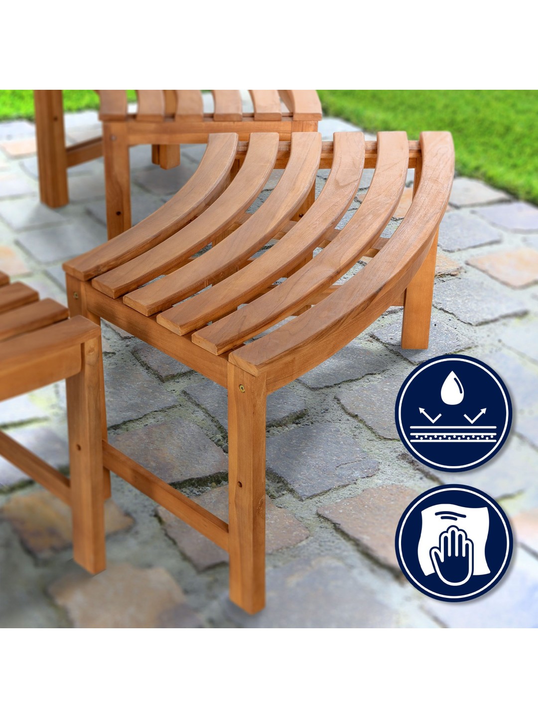 180 graders bænken behøver ikke et ryglæn. Havebænken ser smart ud med sit enkle ydre og teaktræets gyldenbrune farve og kan kombineres med en række forskellige indretningsstile. I haven, placeret omkring et træ, skaber træbænken et smukt billede.