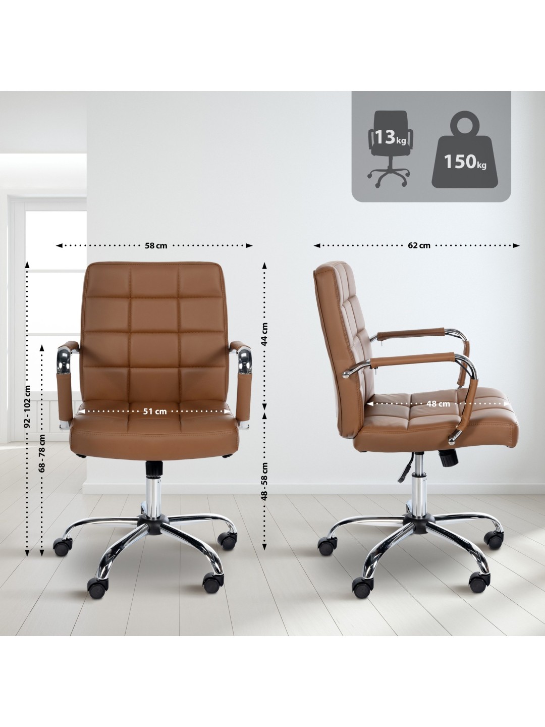 Kontorstolen er trinløst højdejusterbar, så sædehøjden kan justeres mellem 48 og 58 cm. Det betyder, at stolen kan bruges til forskellige arbejdsområder og kropsstørrelser.