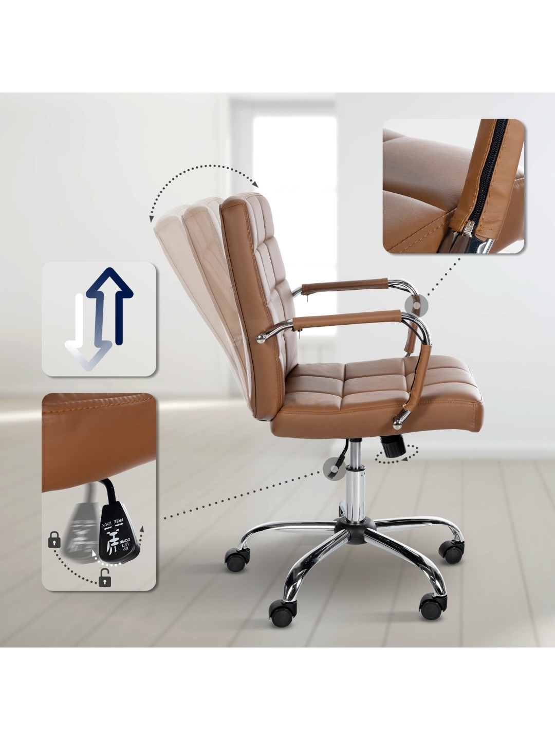 Ashland arbejdsstolen er udtryk for moderne elegance med praktisk funktionalitet. Dens quiltede imiterede læderbetræk giver den ikke kun en fantastisk flair, men tilbyder også en behagelig siddeoplevelse.
