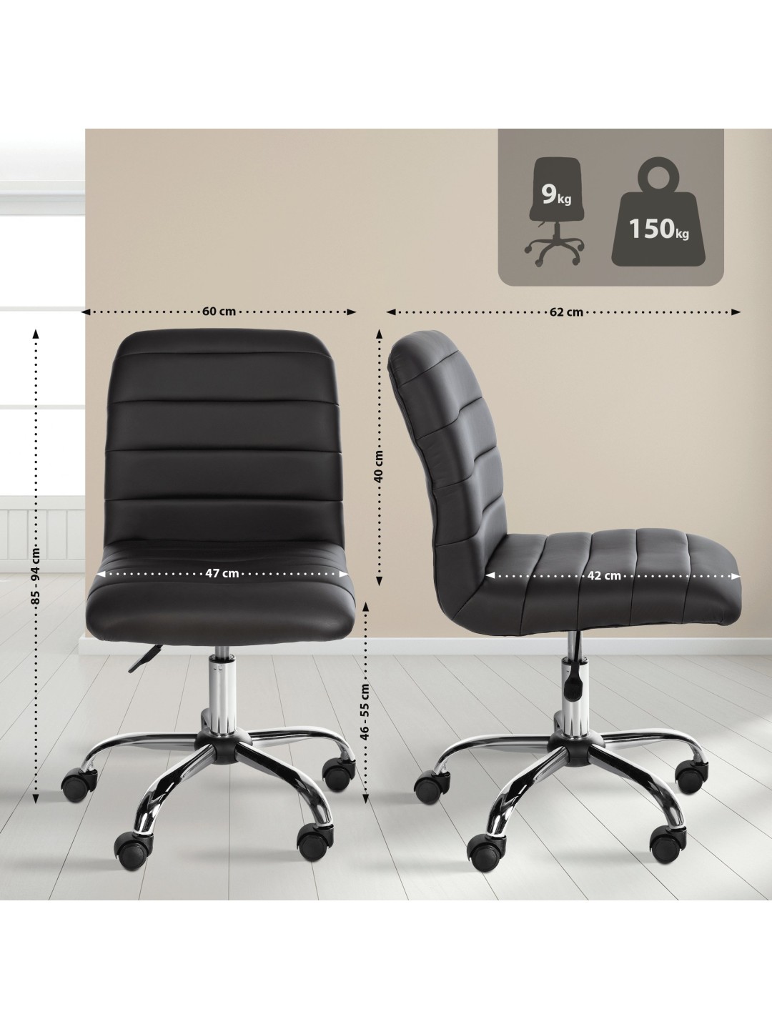 Kontorstolen er trinløst højdejusterbar, så sædehøjden kan justeres mellem 46 og 55 cm. Det betyder, at stolen kan bruges til forskellige arbejdsområder og kropsstørrelser.