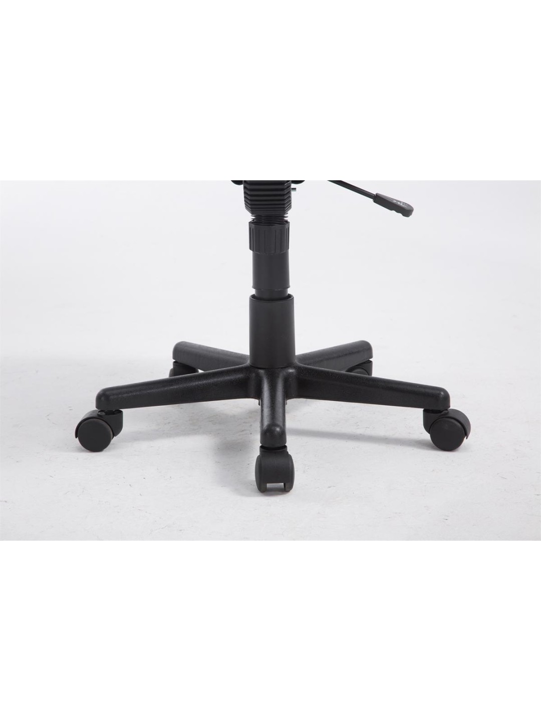 Rammen er lavet af hård plast og er meget stabil. Stolen står sikkert på fem jævnt kørende hjul. Sædehøjden kan justeres trinløst.