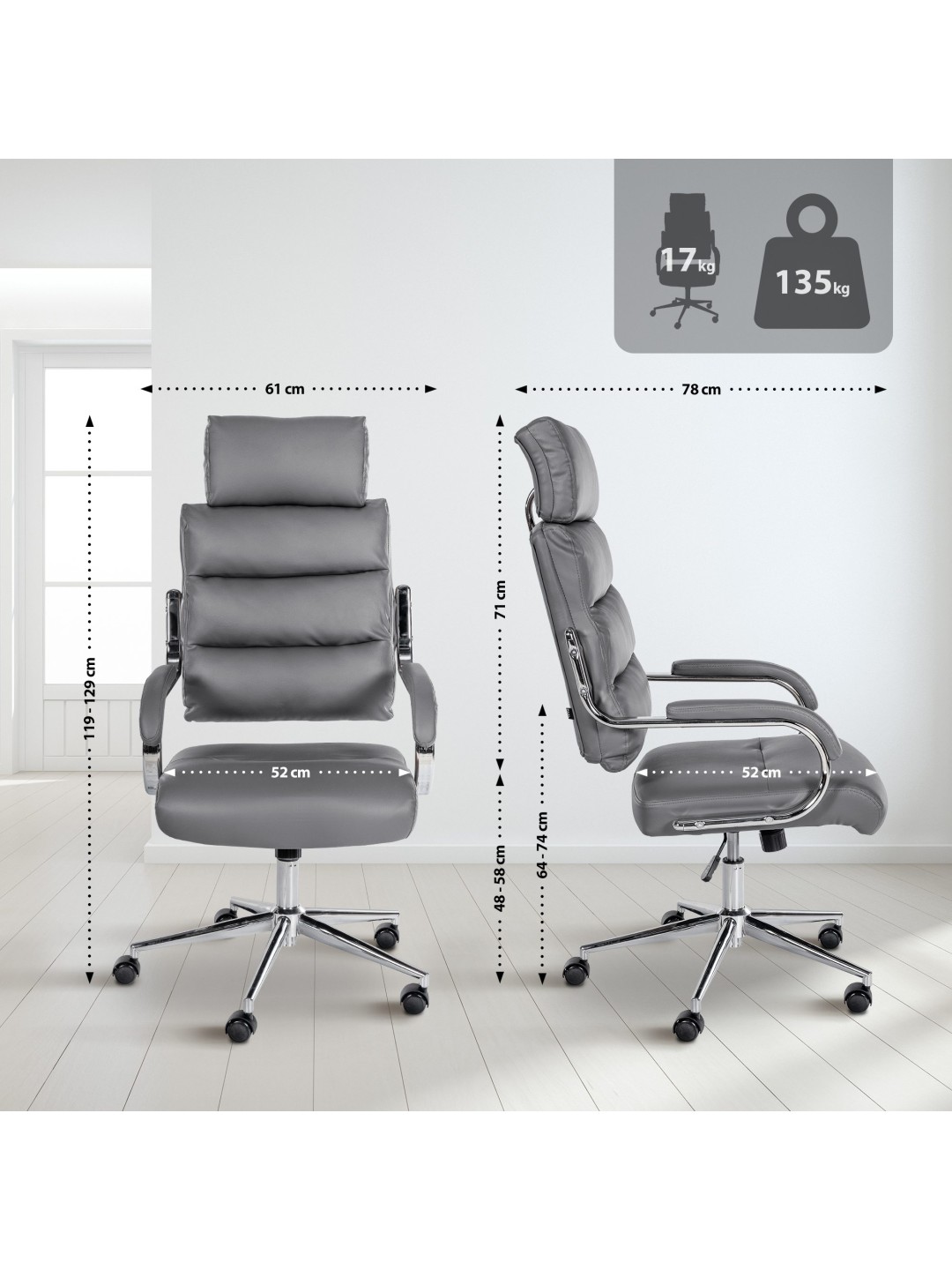 Den tykke polstring på sæde, ryglæn, nakkestøtte og armlæn sikrer en langvarig behagelig siddeoplevelse. Kontorstolen har vippefunktion. Vippemekanismens spænding kan justeres individuelt ved hjælp af håndsvinget under sædet.