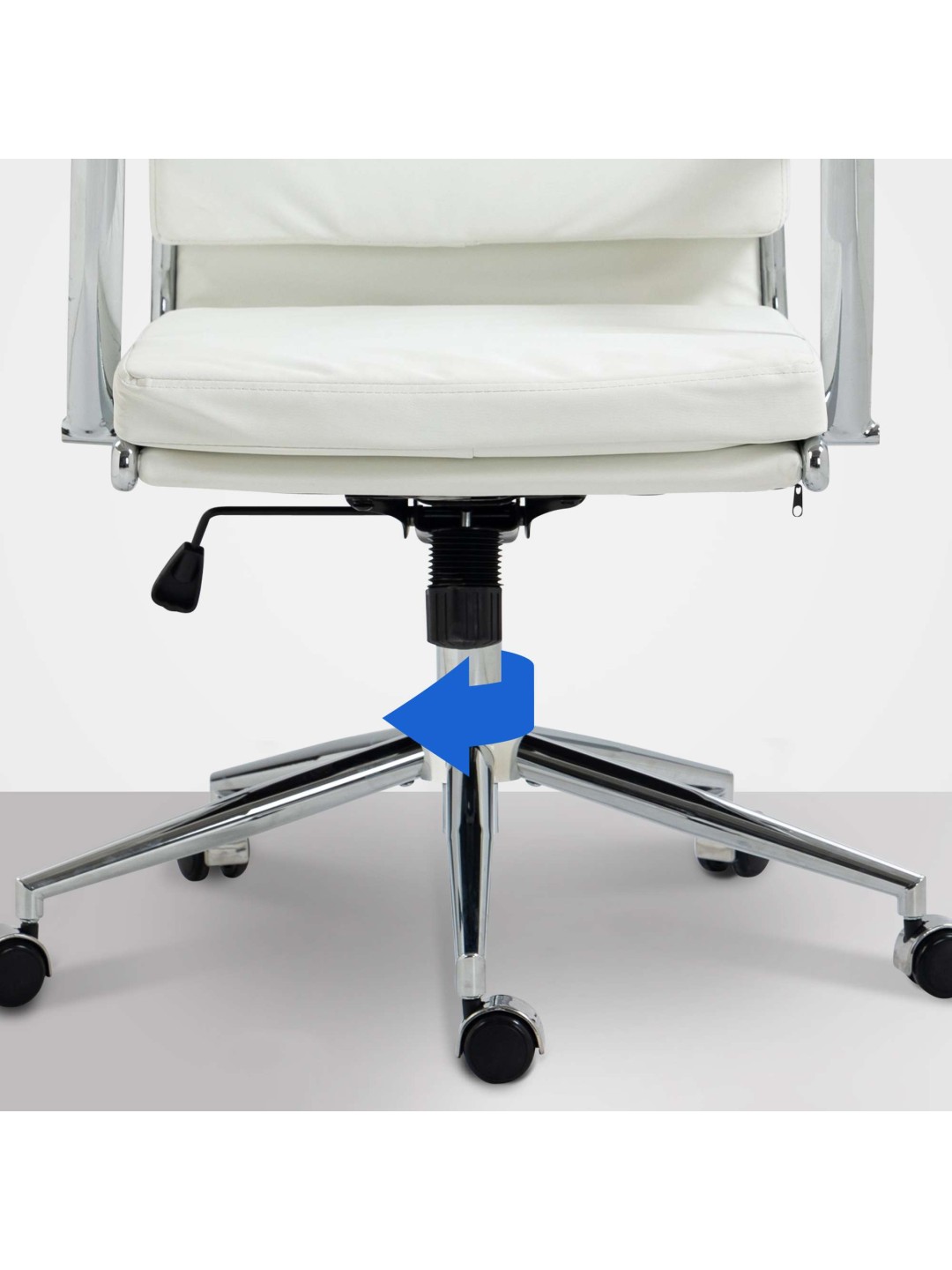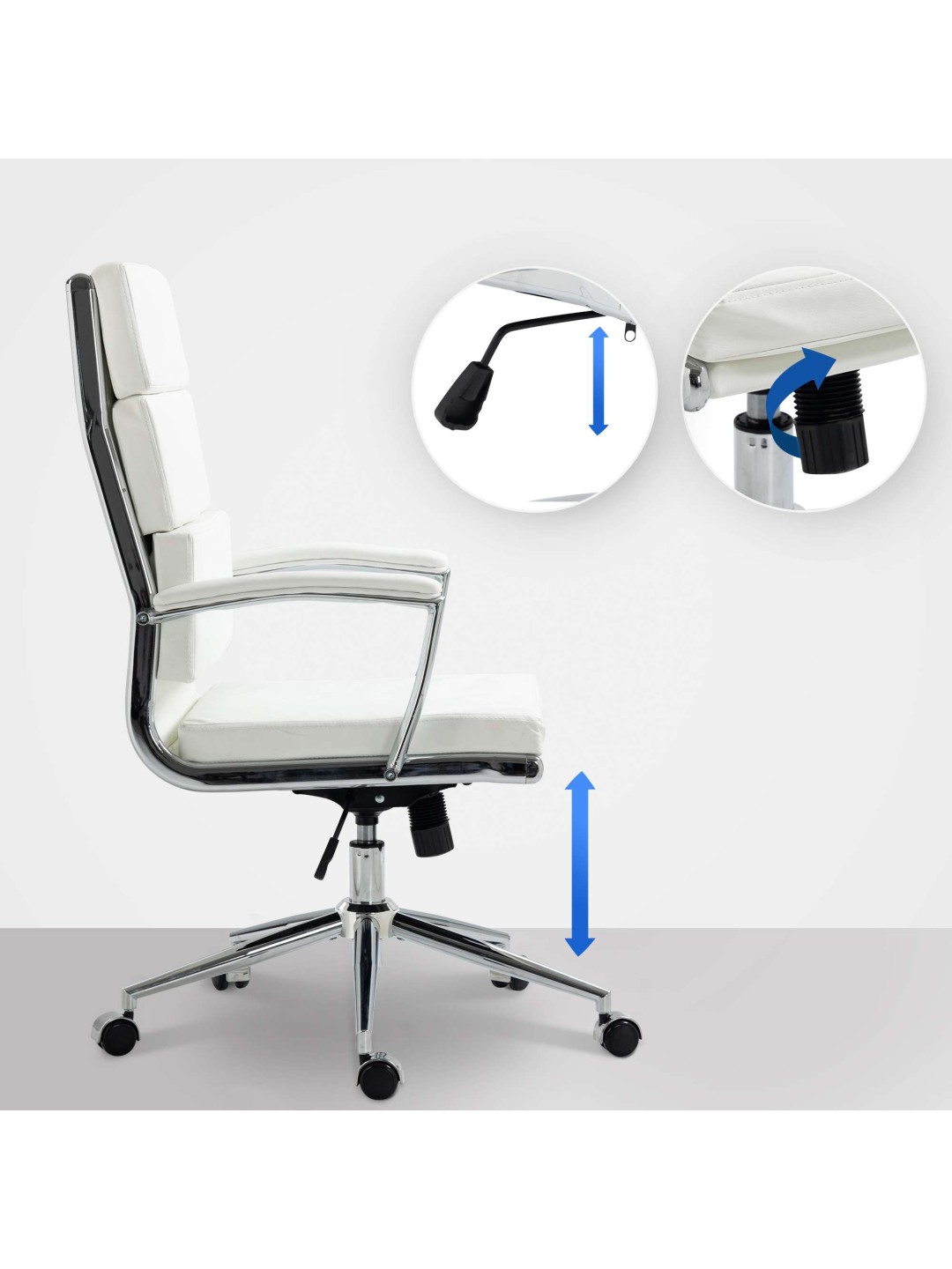 Cleveland kontorstolen kombinerer ergonomisk design med individuel komfort og et stilfuldt look. Det er den perfekte tilføjelse til ethvert kontor, hvor sundhed og velvære på arbejdspladsen er vigtig. Det tredobbelte polstrede ryglæn og den ergonomiske form understøtter din naturlige siddestilling. Med det højdejusterbare sæde, den justerbare vippefunktion og de 360° roterende letløbende hjul tilpasser stolen sig fleksibelt til dine behov. Valget mellem ægte læder, imiteret læder eller stofbetræk giver dig mulighed for at tilpasse designet efter din personlige smag. Den kromramme giver stabilitet og lang levetid. Med sit brede sæde tilbyder Cleveland optimal siddekomfort selv på lange arbejdsdage.