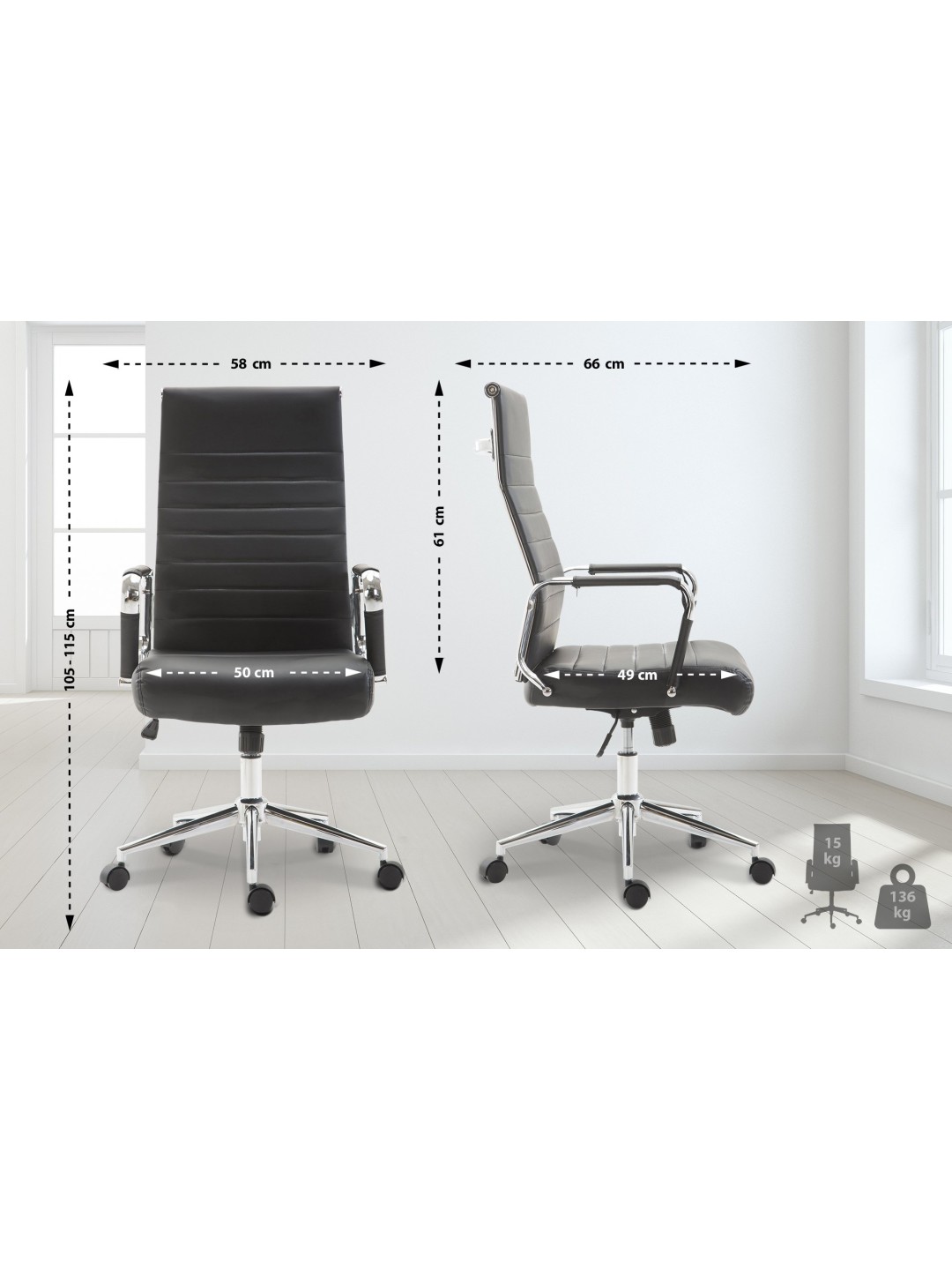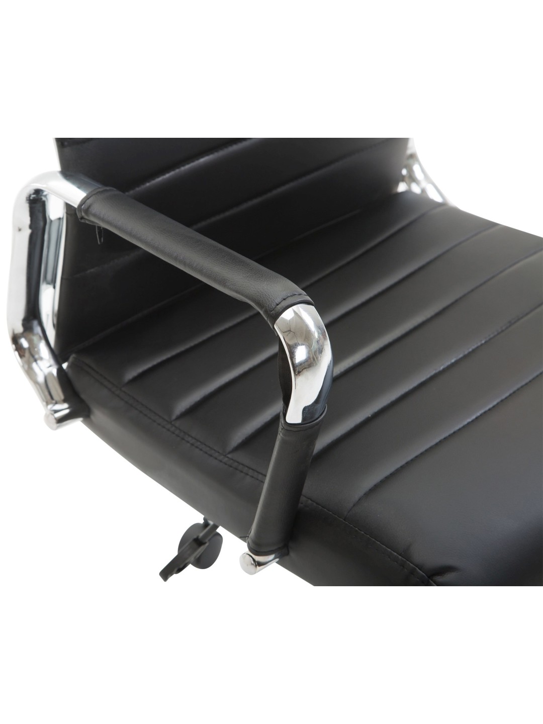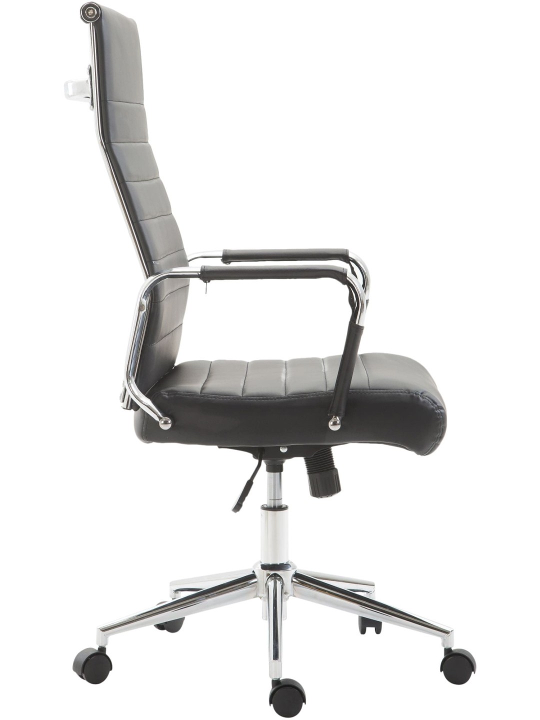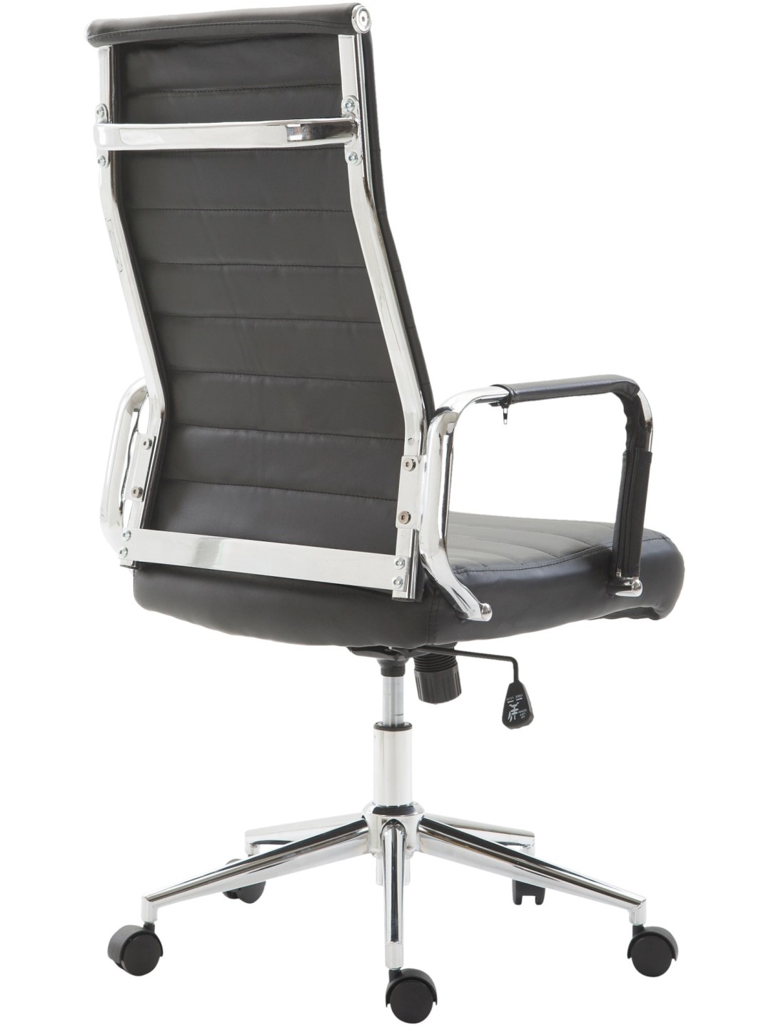 Columbus kontorstol Den eksklusive Columbus kontorstol imponerer ikke kun med sit moderne look, men ingen kan slå den, når det kommer til komfort. Dens højkvalitets polstring og det lette syntetiske læderbetræk sikrer en behagelig siddeoplevelse selv i flere timer. Derudover er sædehøjden trinløst justerbar og garanterer en ergonomisk siddestilling. Ydermere er skrivebordsstolen udstyret med en vippemekanisme, der sikrer mere bevægelsesfrihed. Det elegante metalstel i krom-look og de robuste, buede armlæn med betræk i imiteret læder giver det hele noget ekstra. Stabiliteten sikres af metalstellet i krom-look, som også fås i sort med det sorte betræk. De fem jævntløbende hjul betyder, at du nemt og løst kan rulle hen over gulvet - uanset om det er på hårde eller tæppebelagte gulve.