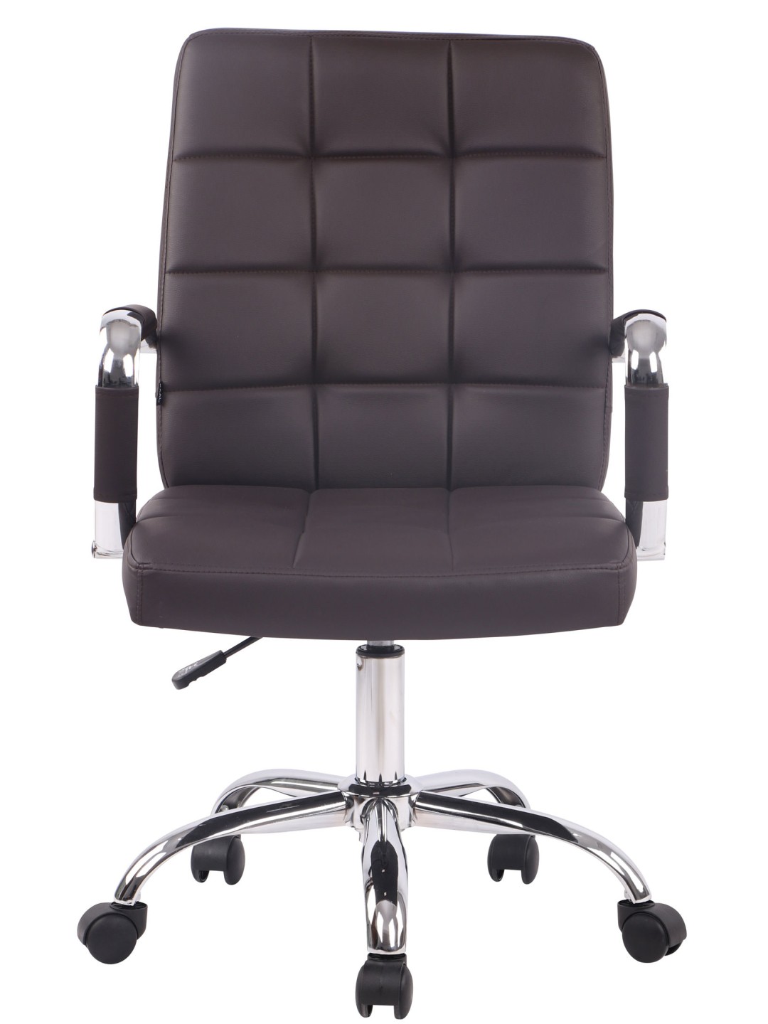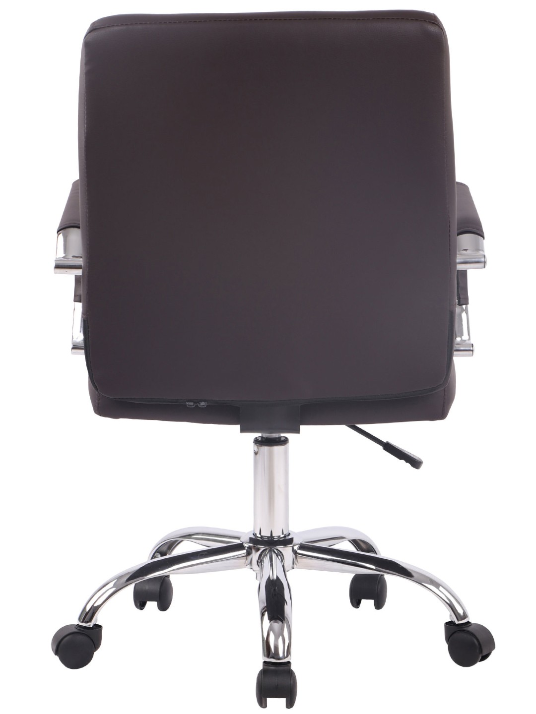Betræk i imiteret læder med de smukke dekorative syninger ser ikke kun elegant ud, det er også særdeles robust og let at passe. Sædehøjden kan justeres trinløst med håndtaget under sædet. Dette garanterer et højt niveau af komfort, mens du arbejder over længere tid. Derudover lover metalstellet i krom-look en lang levetid. Kontorstolen står sikkert på fem jævnt kørende hjul. Uanset om det er hårde eller tæppebelagte gulve - vil du altid kunne rulle let og løst hen over gulvet.