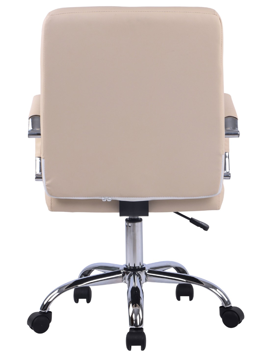 Betræk i imiteret læder med de smukke dekorative syninger ser ikke kun elegant ud, det er også særdeles robust og let at passe. Sædehøjden kan justeres trinløst med håndtaget under sædet. Dette garanterer et højt niveau af komfort, mens du arbejder over længere tid. Derudover lover metalstellet i krom-look en lang levetid. Kontorstolen står sikkert på fem jævnt kørende hjul. Uanset om det er hårde eller tæppebelagte gulve - vil du altid kunne rulle let og løst hen over gulvet.