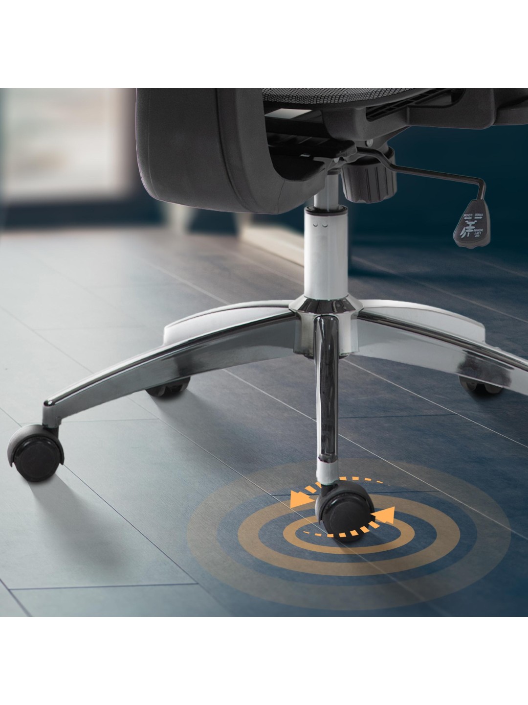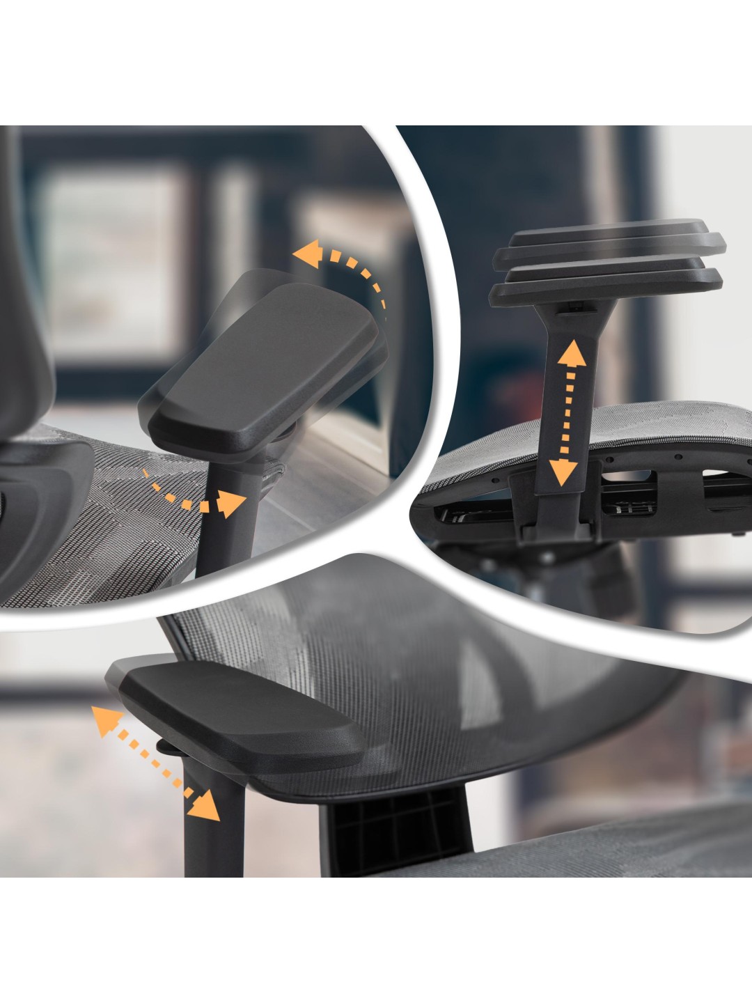 Ryglænet har en justerbar vippemekanisme, en elastisk lændestøtte og en nakkestøtte, der også kan justeres. Mesh-betræk over sæde, ryglæn og nakkestøtte er åndbart. Armlænene aflaster nakke og skuldre og er justerbare i tre dimensioner (højdejusterbar, fremad/bagud, drejelig).