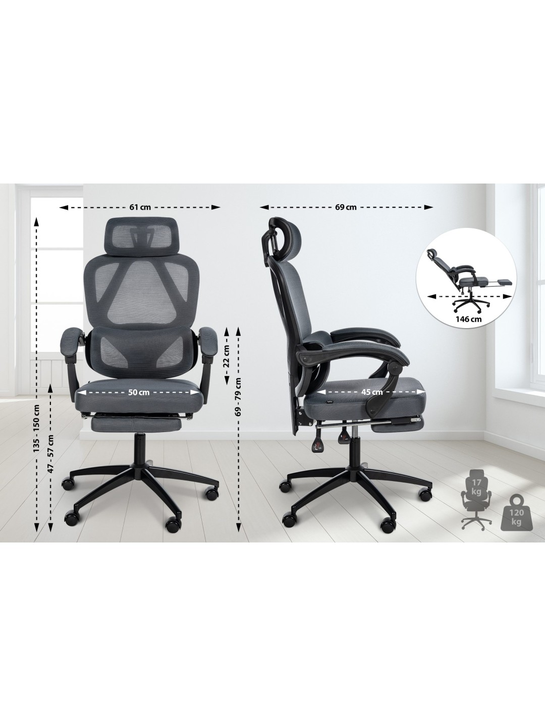 Total højde: hævet + nakkestøtte op: 150 cm