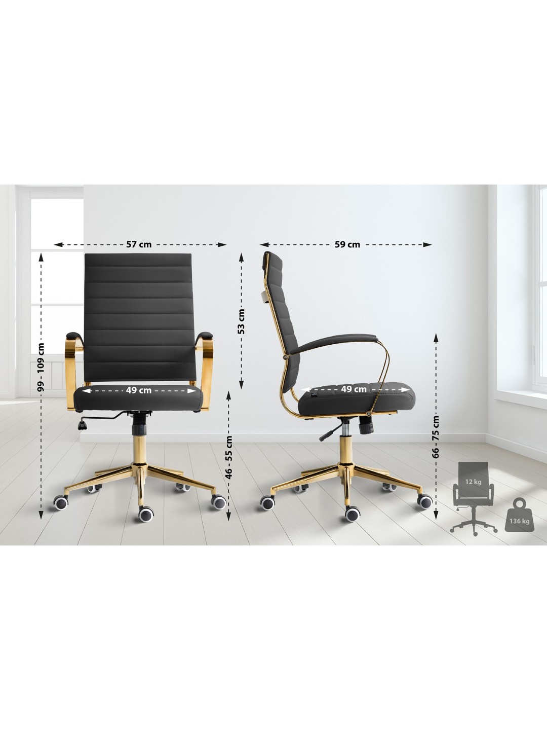 Den robuste konstruktion sikrer høj stabilitet og en maksimal bæreevne på 136 kg. Det stilfulde guldlook og de gummibeklædte, glat kørende hjul beskytter dit gulv og giver dit kontor et strejf af elegance.