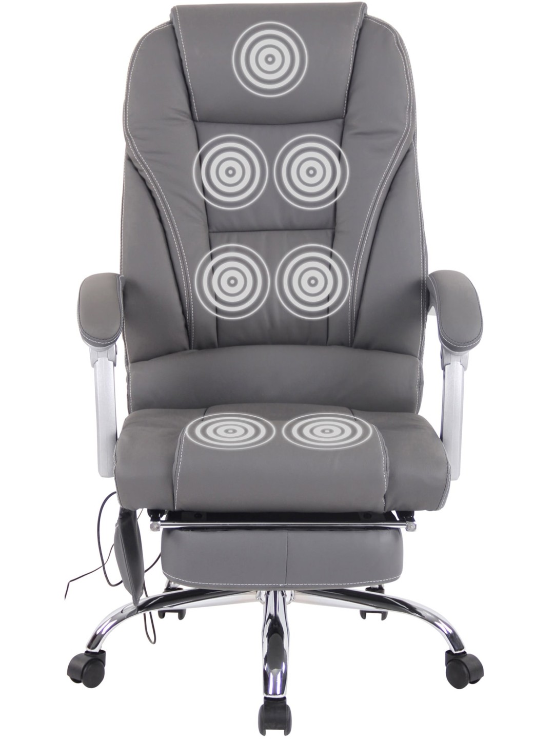 Fodstøtten og det vippelige ryglæn på den ergonomiske stol bidrager også til enestående siddekomfort. Skrivebordsstolen er trinløst højdejusterbar og kan drejes 360 grader. Den står sikkert på metalstellet og fem jævnt kørende hjul, som holder stolen mobil selv på hårde gulve og tæpper. Massagestolen kan holde op til 150 kg.