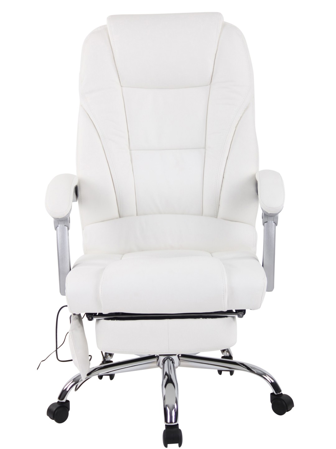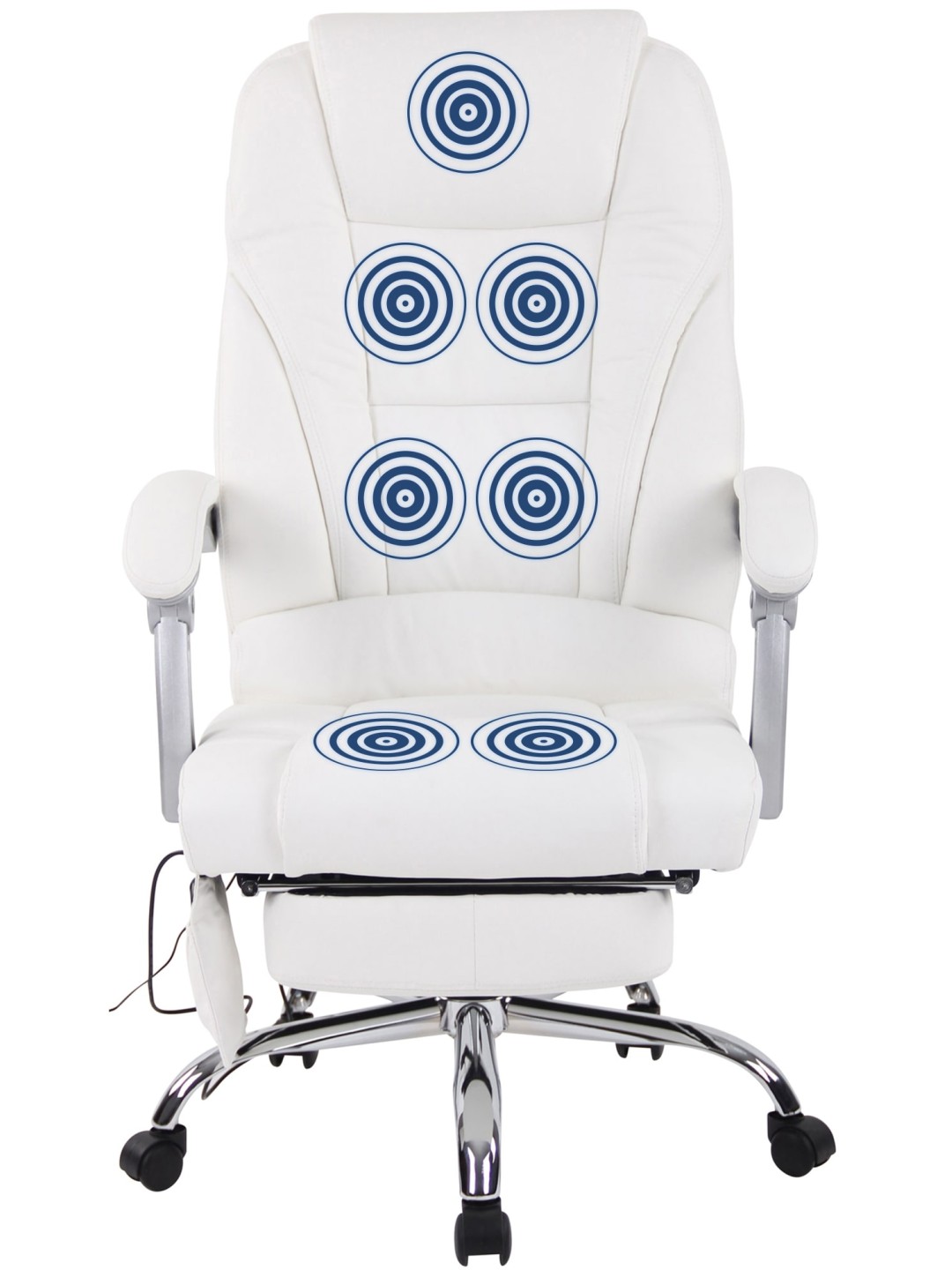 Fodstøtten og det vippelige ryglæn på den ergonomiske stol bidrager også til enestående siddekomfort. Skrivebordsstolen er trinløst højdejusterbar og kan drejes 360 grader. Den står sikkert på metalstellet og fem jævnt kørende hjul, som holder stolen mobil selv på hårde gulve og tæpper. Massagestolen kan holde op til 150 kg.