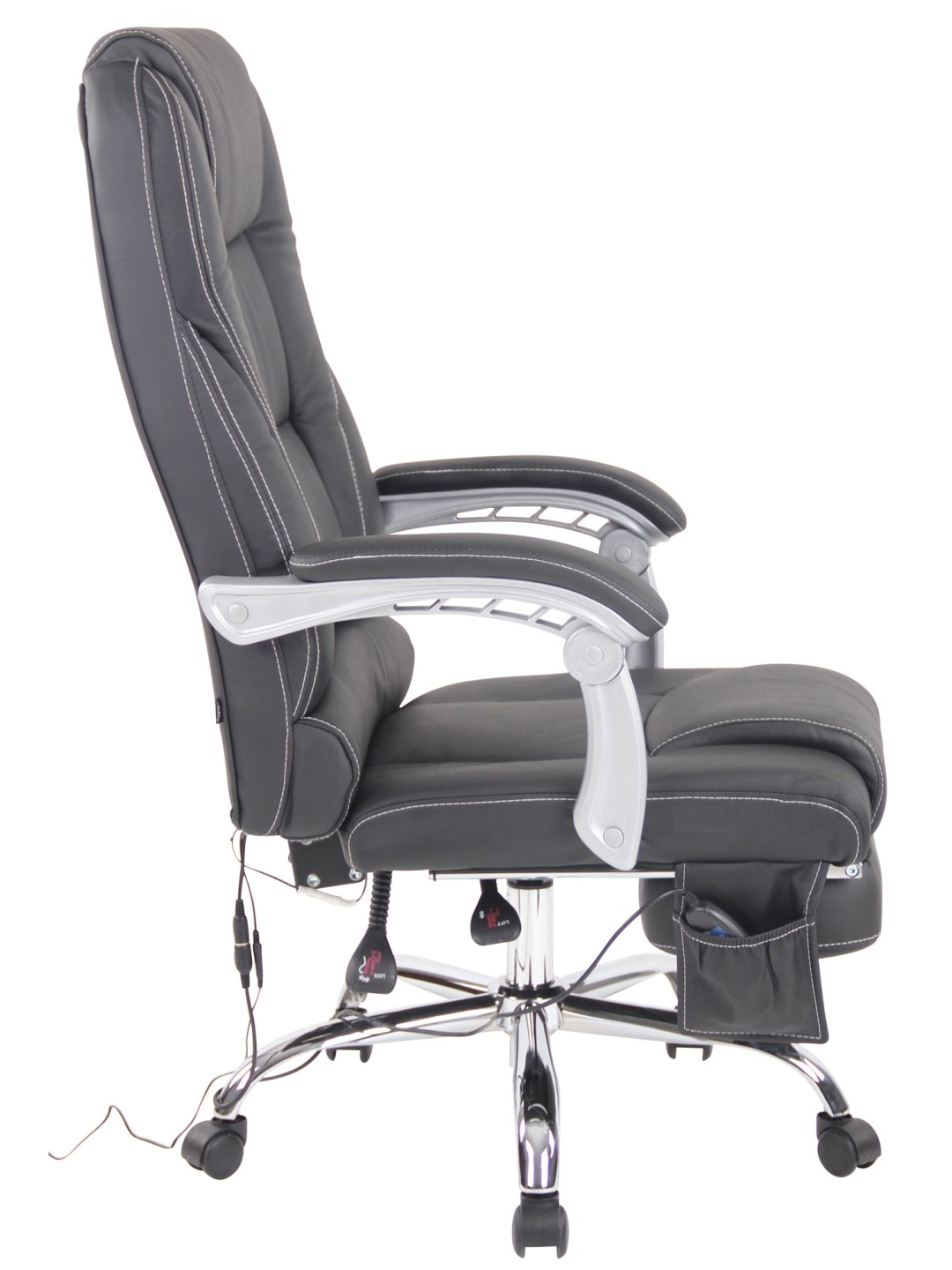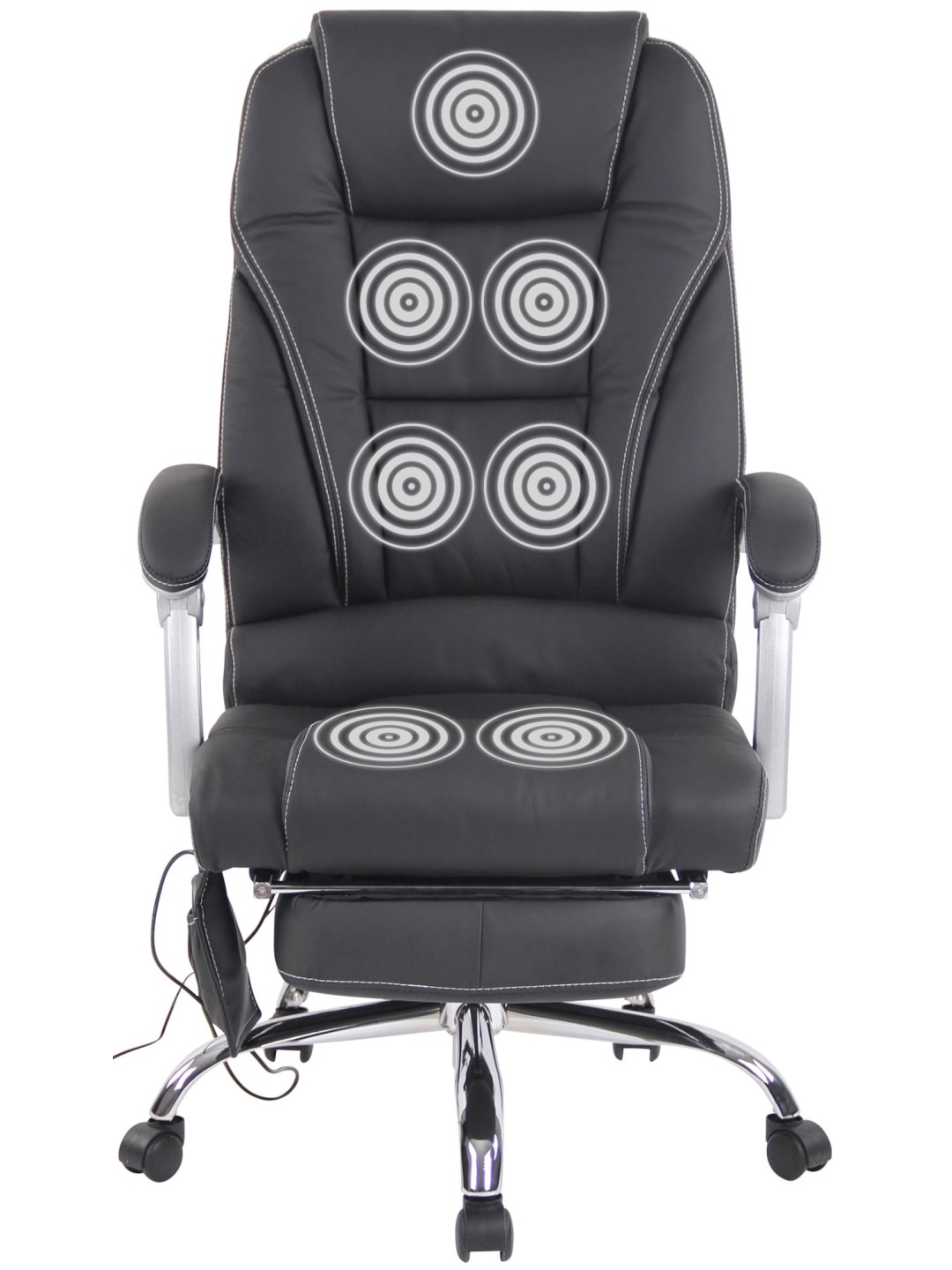 Fodstøtten og det vippelige ryglæn på den ergonomiske stol bidrager også til enestående siddekomfort. Skrivebordsstolen er trinløst højdejusterbar og kan drejes 360 grader. Den står sikkert på metalstellet og fem jævnt kørende hjul, som holder stolen mobil selv på hårde gulve og tæpper. Massagestolen kan holde op til 150 kg.