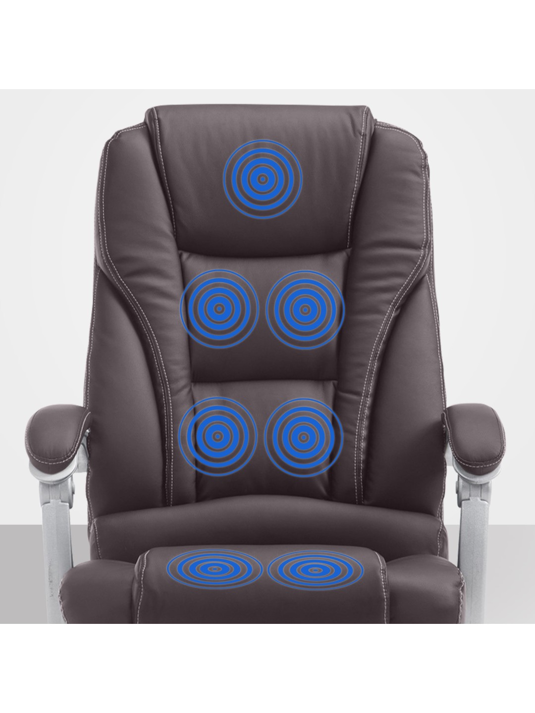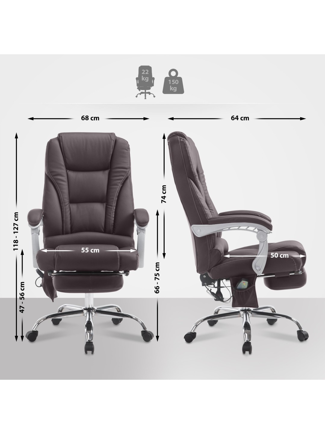 Denne kontorstol har en 7-punkts massagefunktion, der styres af en kabelfjernbetjening. Stolen kan drejes 360 grader og er højdejusterbar, hvilket giver mulighed for individuel justering. Ryglænet læner sig tilbage, og stolen har tyk polstring for ekstra komfort. En vibrationsfunktion og en timer er også integreret. Stolen er vipbar og kan fastgøres i forskellige positioner. En fodstøtte er også tilgængelig.