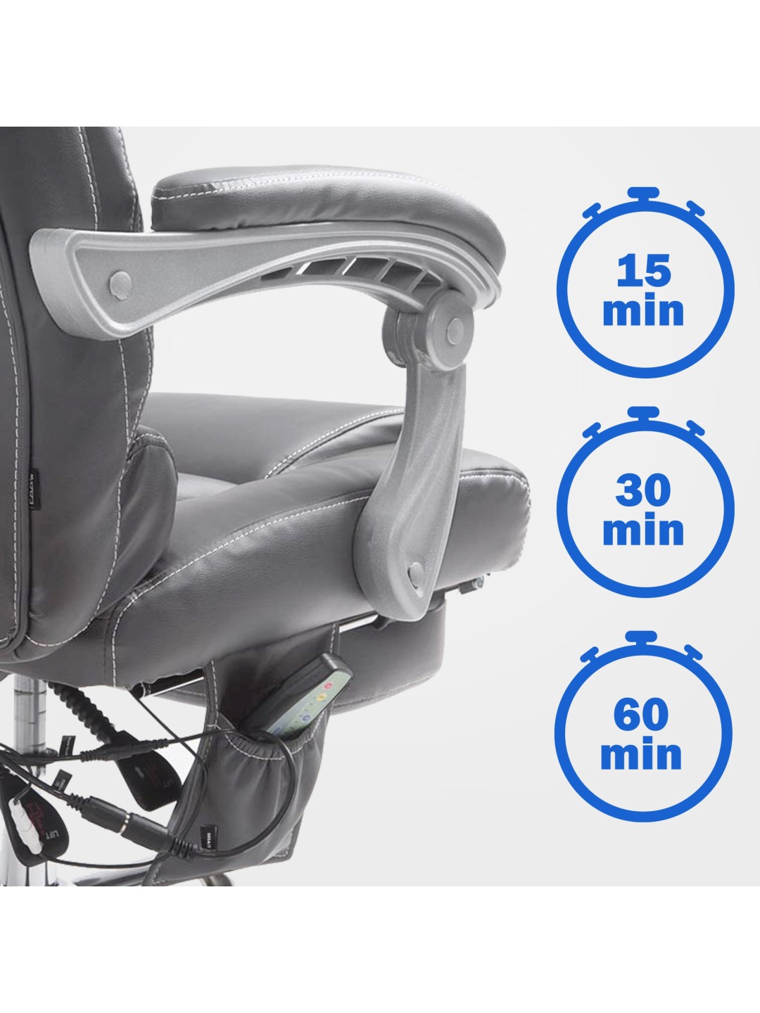 Denne kontorstol har en 7-punkts massagefunktion, der styres af en kabelfjernbetjening. Stolen kan drejes 360 grader og er højdejusterbar, hvilket giver mulighed for individuel justering. Ryglænet læner sig tilbage, og stolen har tyk polstring for ekstra komfort. En vibrationsfunktion og en timer er også integreret. Stolen er vipbar og kan fastgøres i forskellige positioner. En fodstøtte er også tilgængelig.
