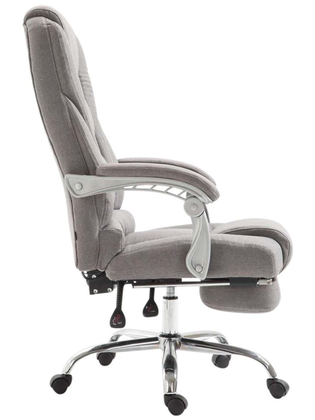 Denne imponerende Pacific kontorstol imponerer ikke kun med sit elegante look, men også når det kommer til komfort og holdbarhed. Dens gode polstring og det plejevenlige stofbetræk med stilfulde dekorative sømme sikrer en behagelig siddeoplevelse, selv når du opholder dig der i længere tid. Takket være den trinløst justerbare sædehøjde garanterer Pacific kontorstolen også en ergonomisk siddestilling hele tiden. Den let justerbare fod- og ryglæn sørger desuden for en behagelig pause ind imellem, hvor du kan læne dig tilbage og sætte benene op. Den står sikkert på fem jævnt kørende hjul og en metalramme i krom-look. Lige meget om det er hårde eller tæppebelagte gulve - du kan altid rulle let og løst hen over gulvet.
