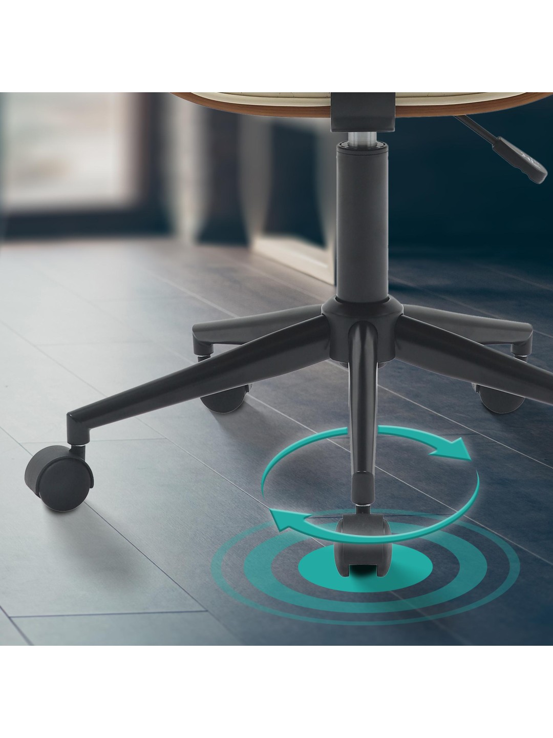 Højdejusterbarheden giver mulighed for individuel justering og stolen kan drejes 360 grader rundt om sin egen akse. Metalrammen med sine fem jævnt kørende hjul er så stabil, at den sikkert kan belastes med op til 120 kg.