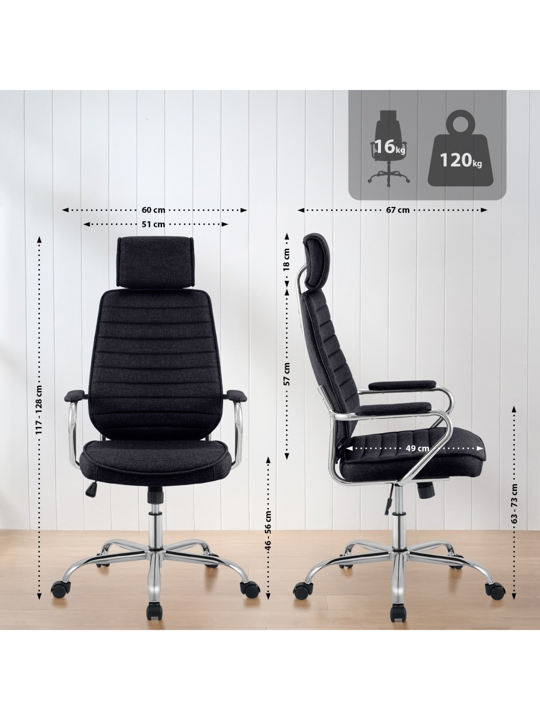 Ryglænet er ergonomisk formet og har nakkestøtte. Den trinløst højdejusterbare skrivebordsstol har en vippemekanisme, hvor vippespændingen kan justeres variabelt. Sædet kan også låses fast.