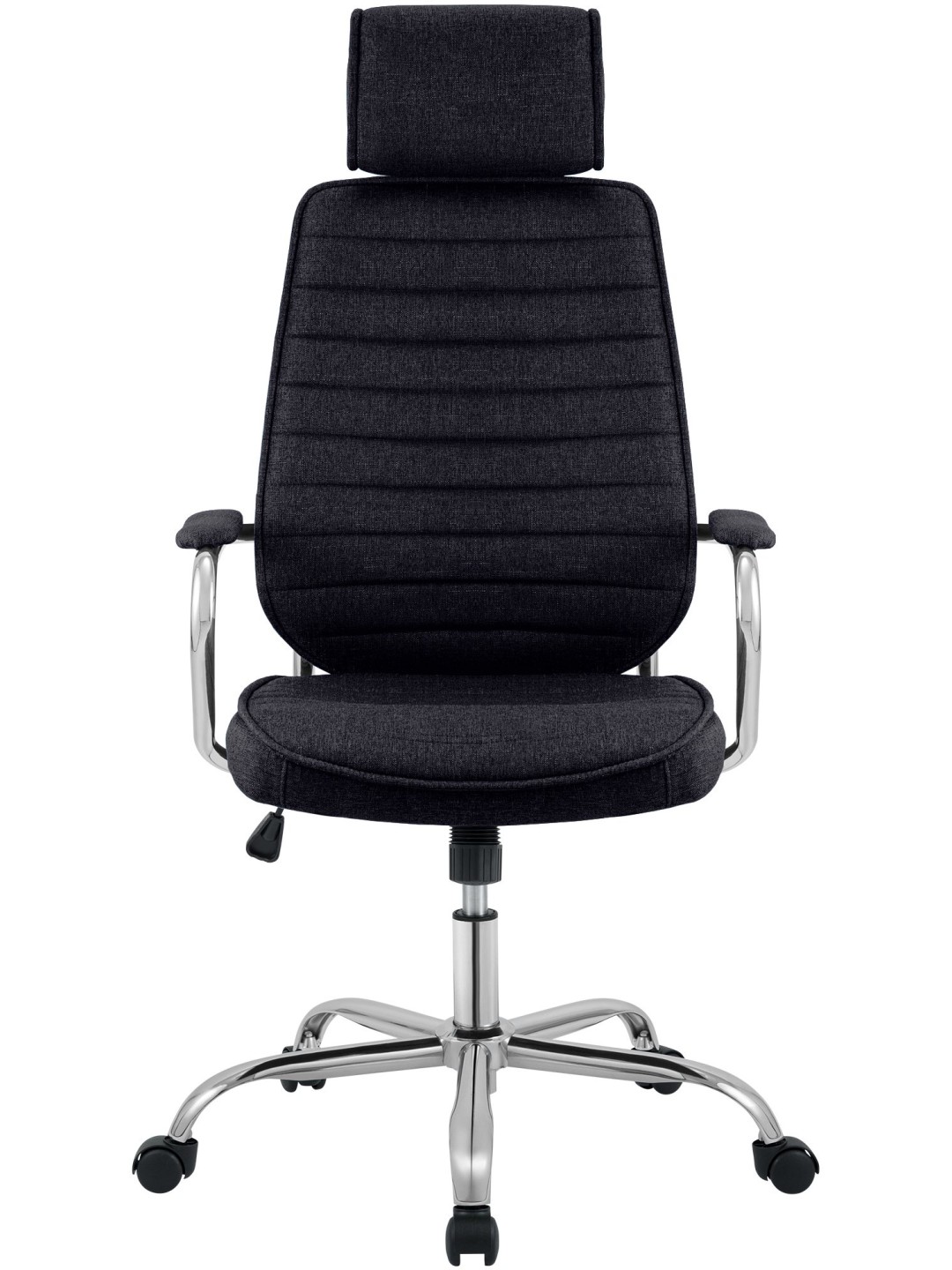 Kontorstolen står på et robust metalstel med fem jævnt kørende hjul.