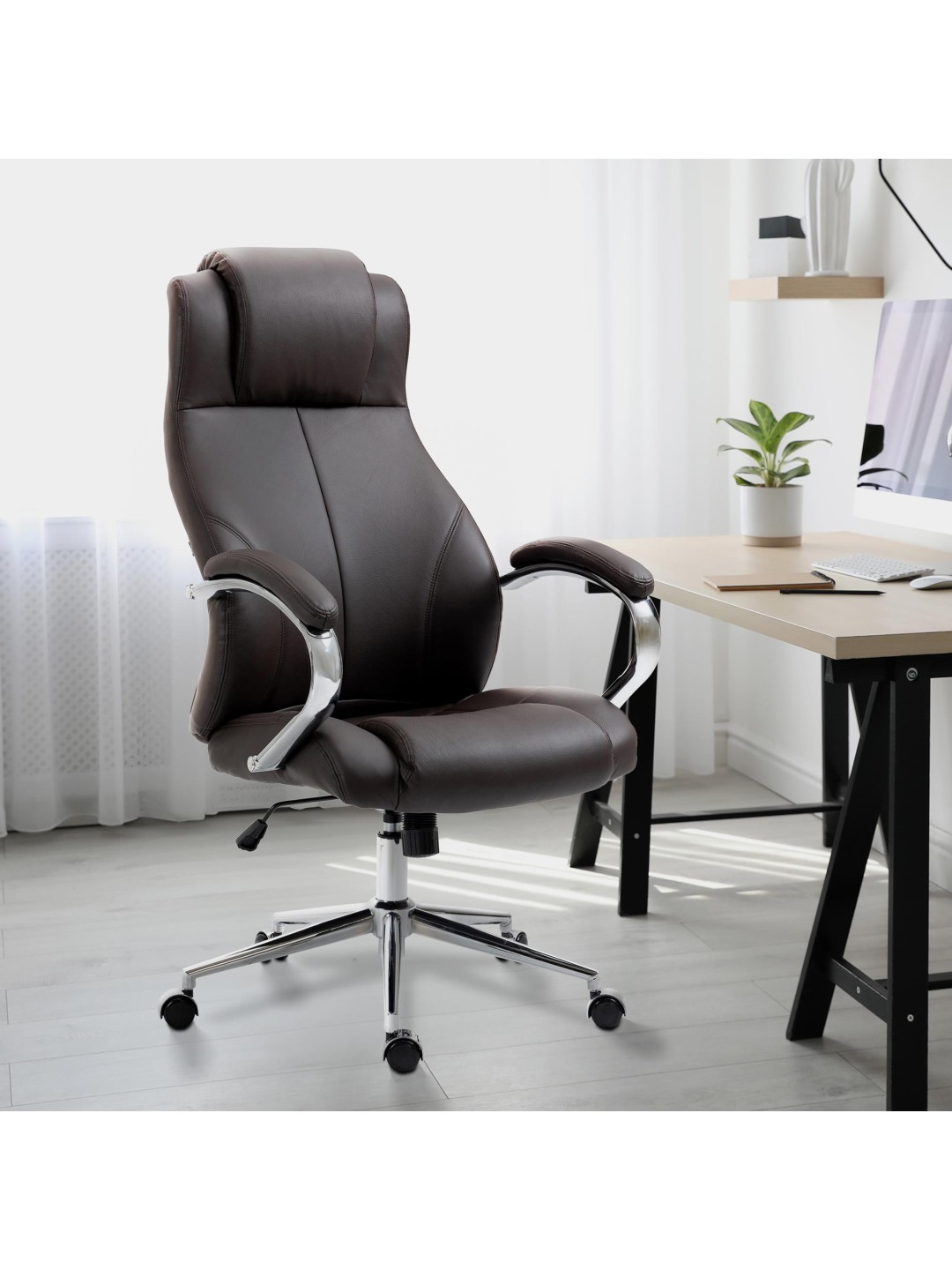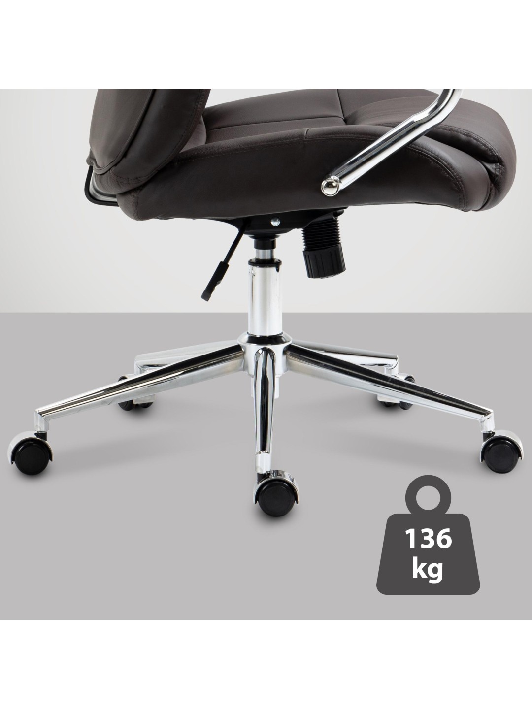 Betrækket har et ægte læderbetræk af slidstærkt okselæder og stolestellet er lavet af metal med kromlook. Med fem bevægelige, letløbende plasthjul muliggør drejestolen ubesværet bevægelse i arbejdsområdet.