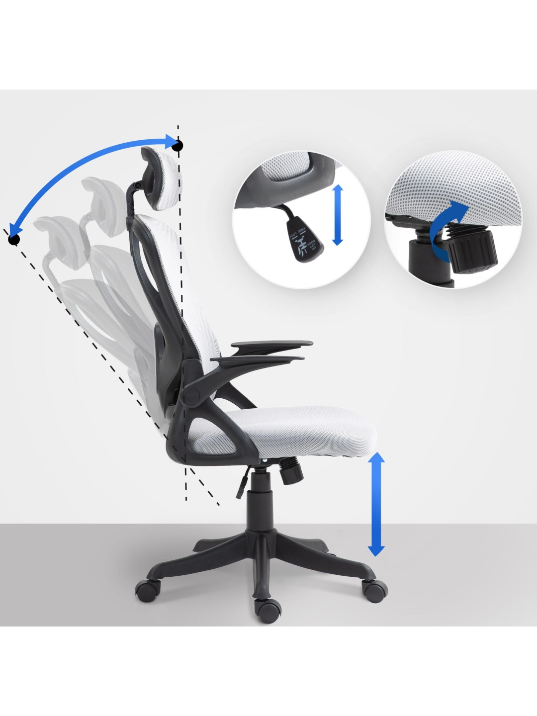 Drejestolen skylder sit høje niveau af siddekomfort til dens talrige ergonomiske egenskaber: Ryglænet har en justerbar vippemekanisme, en lændestøtte og en nakkestøtte, som også kan justeres. Meshbetræk over ryglæn og nakkestøtte er åndbart. Armlænene aflaster nakke og skuldre og kan også klappes op.