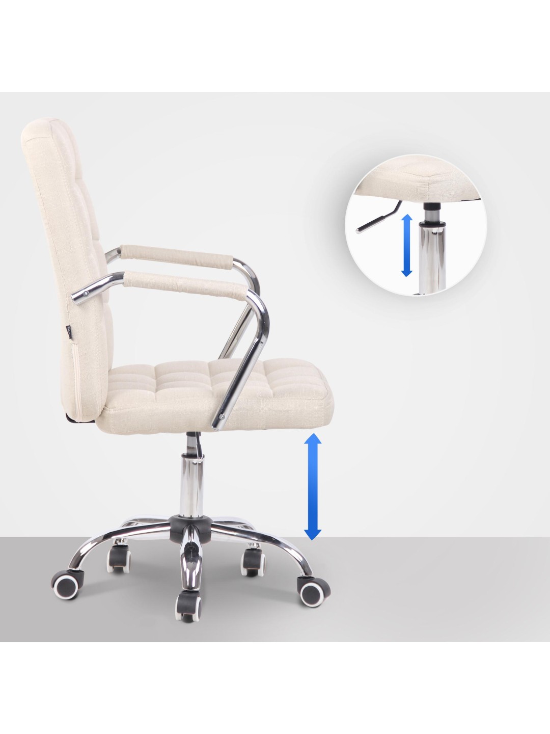 Drejestolen står sikkert på et stel af metal i krom-look. De fem glidende hjul muliggør let bevægelse, og skrivebordsstolen kan sikkert holde op til 120 kg.