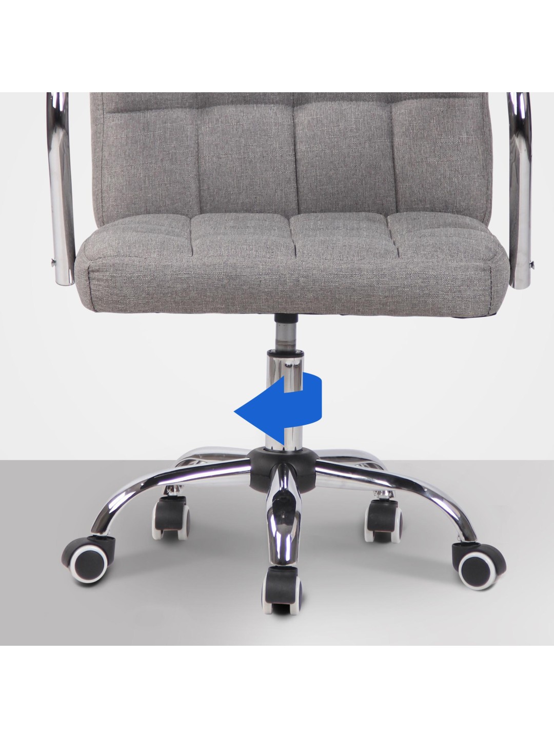 Drejestolen står sikkert på et stel af metal i krom-look. De fem glidende hjul muliggør let bevægelse, og skrivebordsstolen kan sikkert holde op til 120 kg.