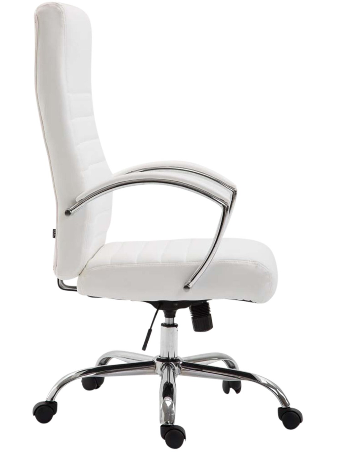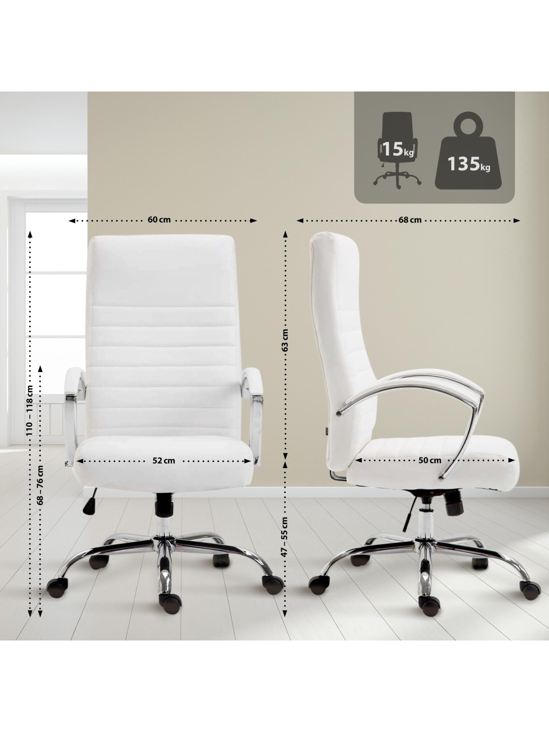 Lavet af højkvalitets imiteret læder, stolen i krom-look udstråler elegance og er også nem at passe. Den robuste drejestol, udstyret med letvægts plastikhjul, er designet til en belastning på op til 136 kg.