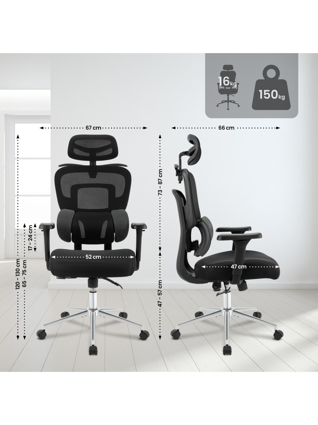 Det polstrede sæde og det åndbare mesh-betræk over ryglænet og nakkestøtten giver ekstra komfort. Med en bæreevne på op til 150 kg er den ergonomiske skrivebordsstol Lothenda både robust og holdbar.