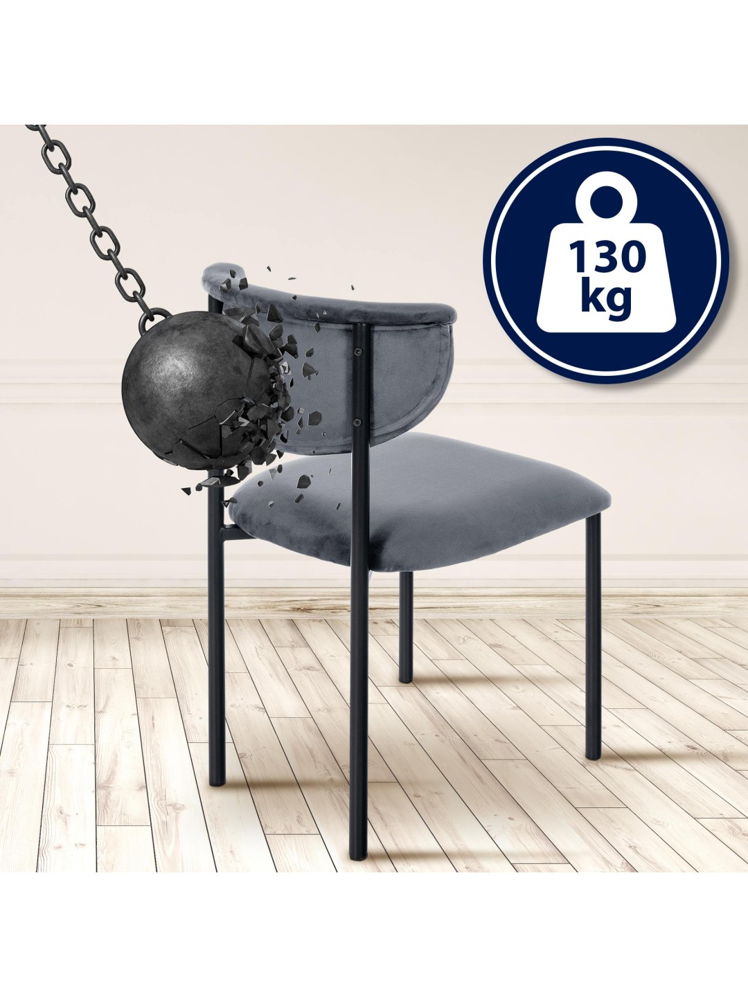 Den robuste metalkonstruktion garanterer stabilitet og kan holde op til 130 kg. Samtidig giver det højkvalitets fløjlsbetrækket stolen et luksuriøst præg og er særdeles slidstærkt - ideel til hverdagsbrug, det være sig i spisestuen, stuen eller hjemmekontoret.