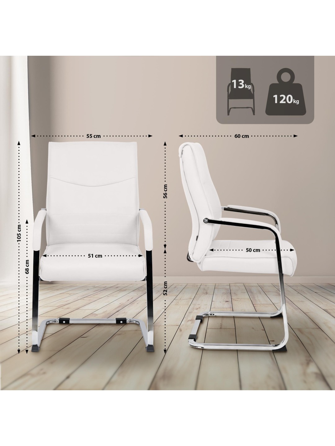 Den stabile udkragningsramme lavet af forkromet stål giver pålidelig stabilitet. Eventuelt sikrer letplejende kunstlæderbetræk eller slidstærkt stof et højkvalitetsudseende og behagelig fornemmelse. Gulvbeskyttere under løberne beskytter følsomme gulve og forbedrer grebet på glatte overflader. Hver stol kan holde op til 120 kg, hvilket gør den ideel til meget brugte møder og receptionsområder.
