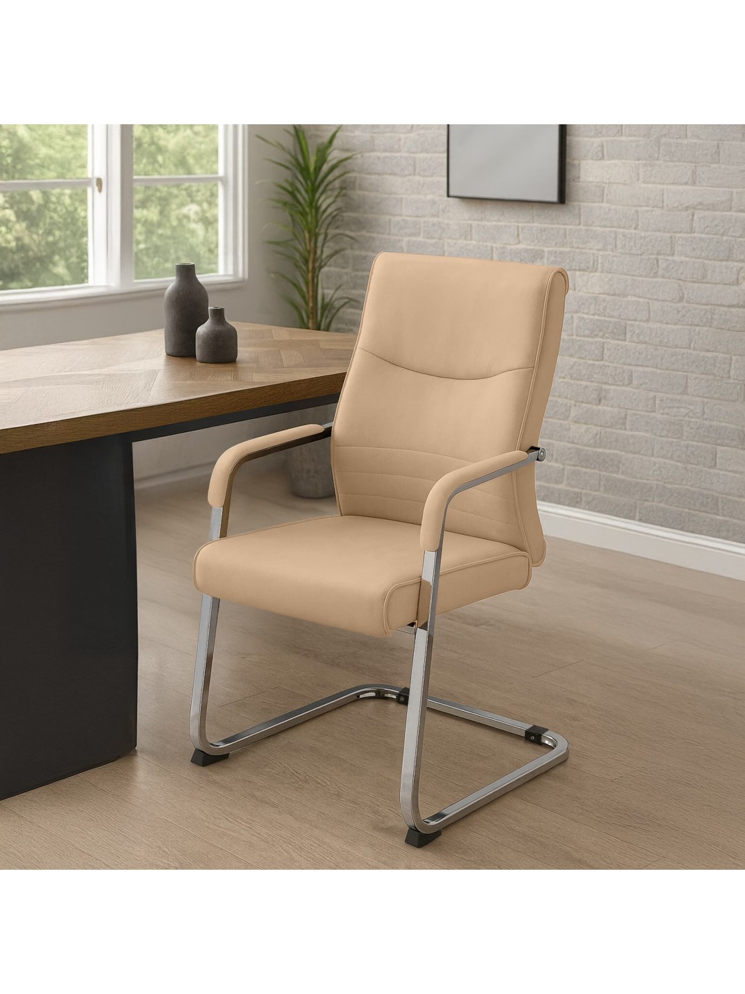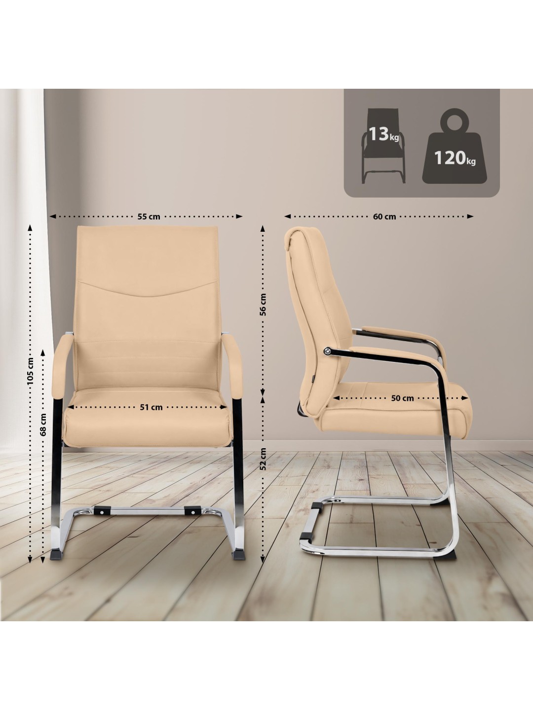 Den stabile udkragningsramme lavet af forkromet stål giver pålidelig stabilitet. Eventuelt sikrer letplejende kunstlæderbetræk eller slidstærkt stof et højkvalitetsudseende og behagelig fornemmelse. Gulvbeskyttere under løberne beskytter følsomme gulve og forbedrer grebet på glatte overflader. Hver stol kan holde op til 120 kg, hvilket gør den ideel til meget brugte møder og receptionsområder.