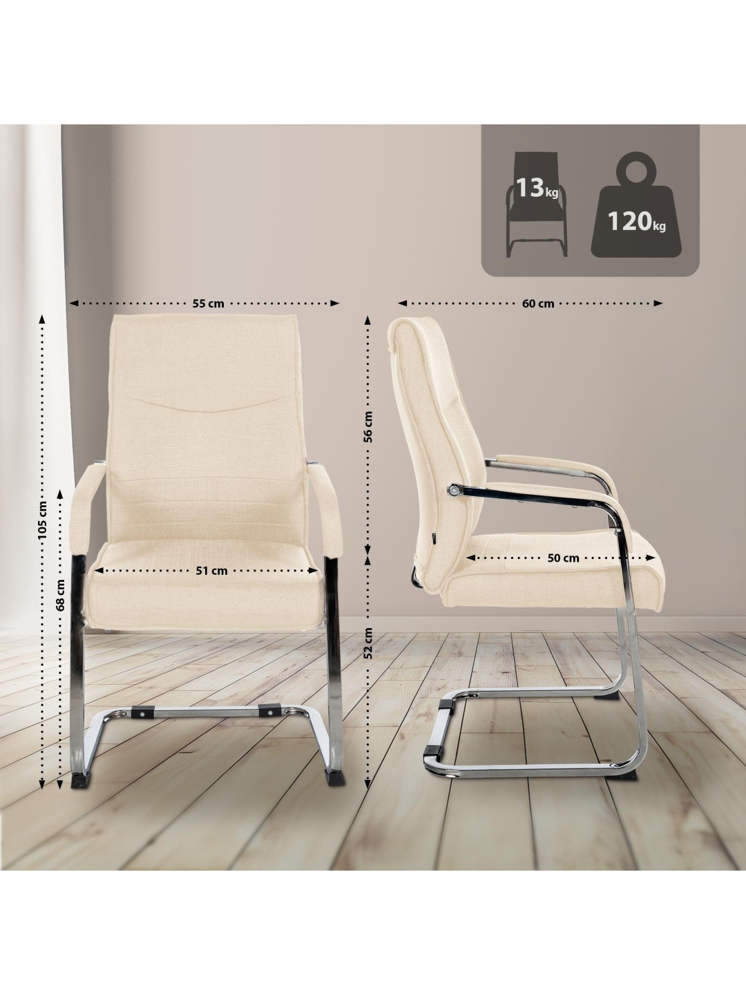 Den stabile udkragningsramme lavet af forkromet stål giver pålidelig stabilitet. Eventuelt sikrer letplejende kunstlæderbetræk eller slidstærkt stof et højkvalitetsudseende og behagelig fornemmelse. Gulvbeskyttere under løberne beskytter følsomme gulve og forbedrer grebet på glatte overflader. Hver stol kan holde op til 120 kg, hvilket gør den ideel til meget brugte møder og receptionsområder.