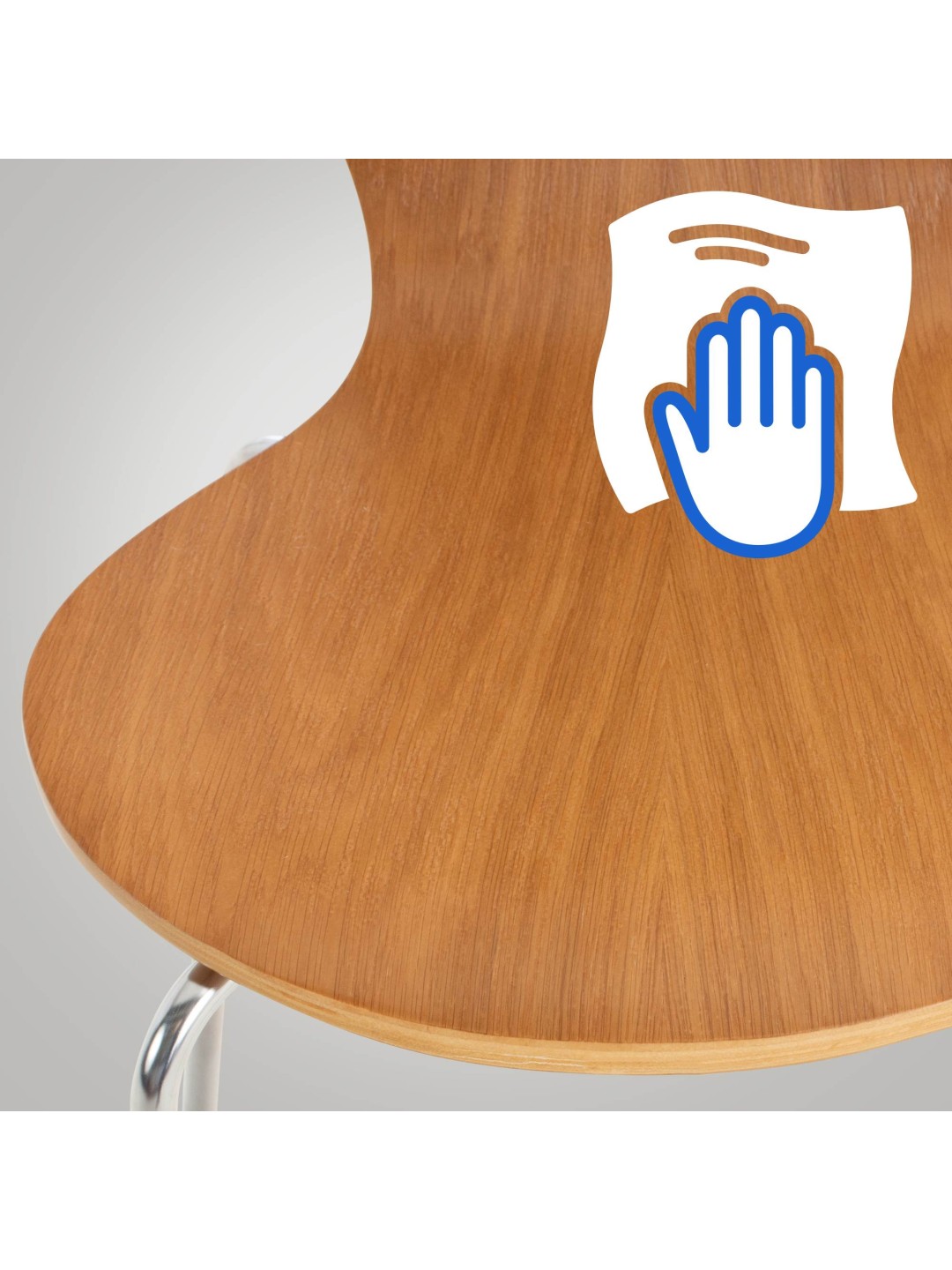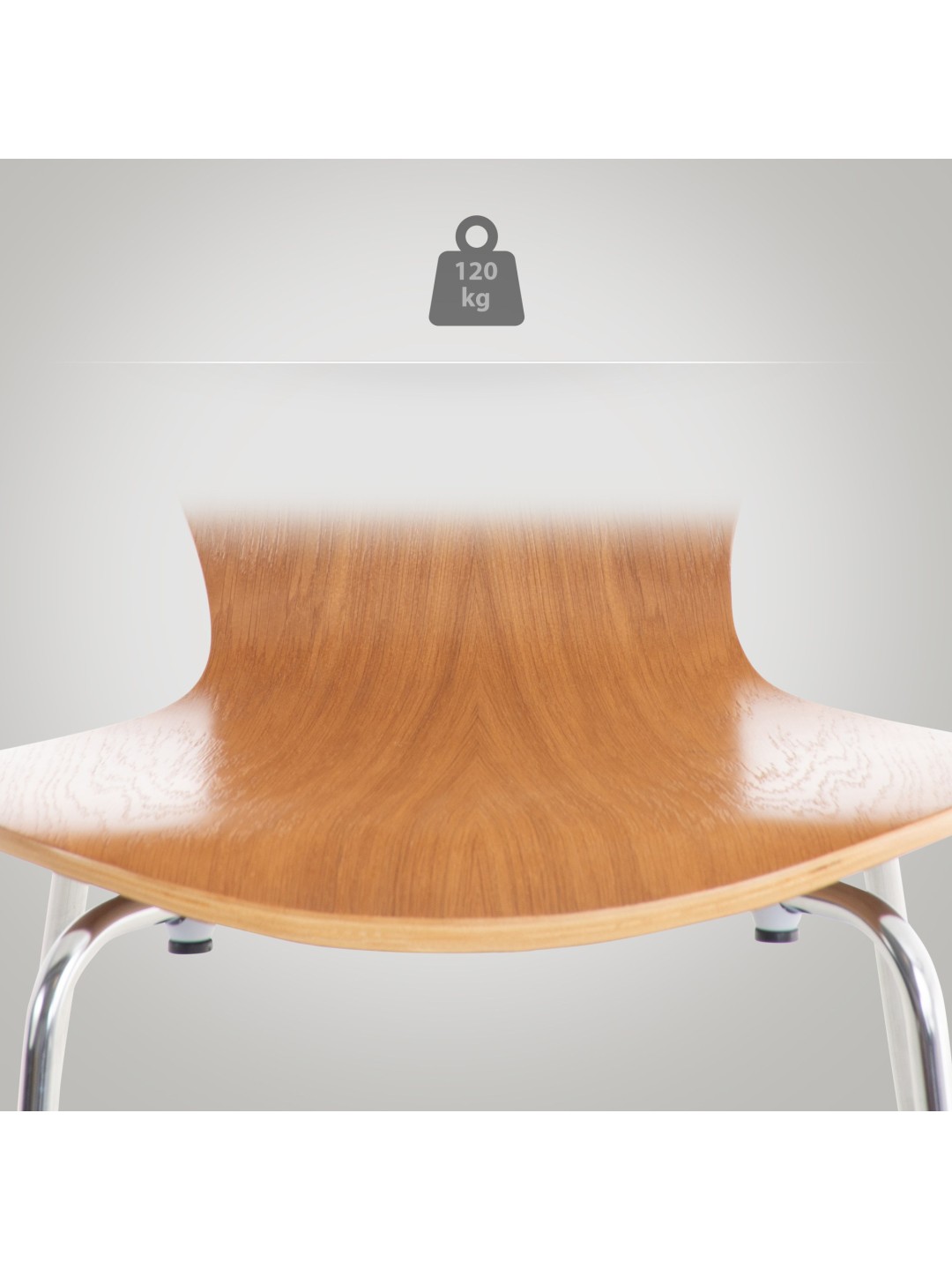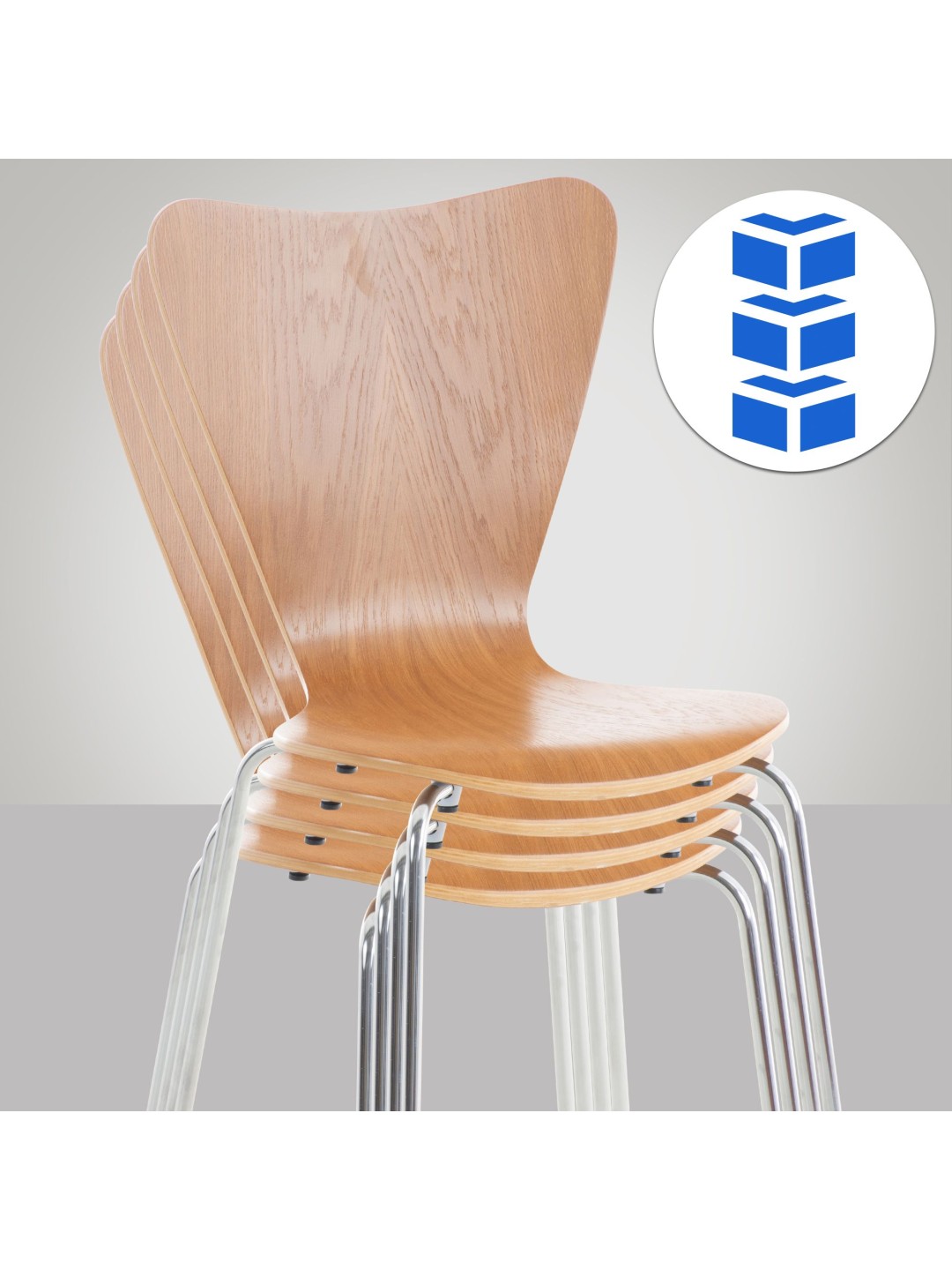 Denne besøgsstol er ideel til venteværelser, messer og andre arrangementer. Udover sit udseende og tidløse design er denne gæstestol særligt kendetegnet ved sit ergonomisk formede sæde, som gør, at selv længere siddeperioder ikke bliver anstrengende. Sædet er lavet af lakeret træ (farverne "eg" og "valnød" er lavet af ægte træfiner). Metalrammen i krom-look sikrer et stabilt og sikkert stativ. Når de ikke er i brug, kan stolene stables og opbevares for at spare plads.