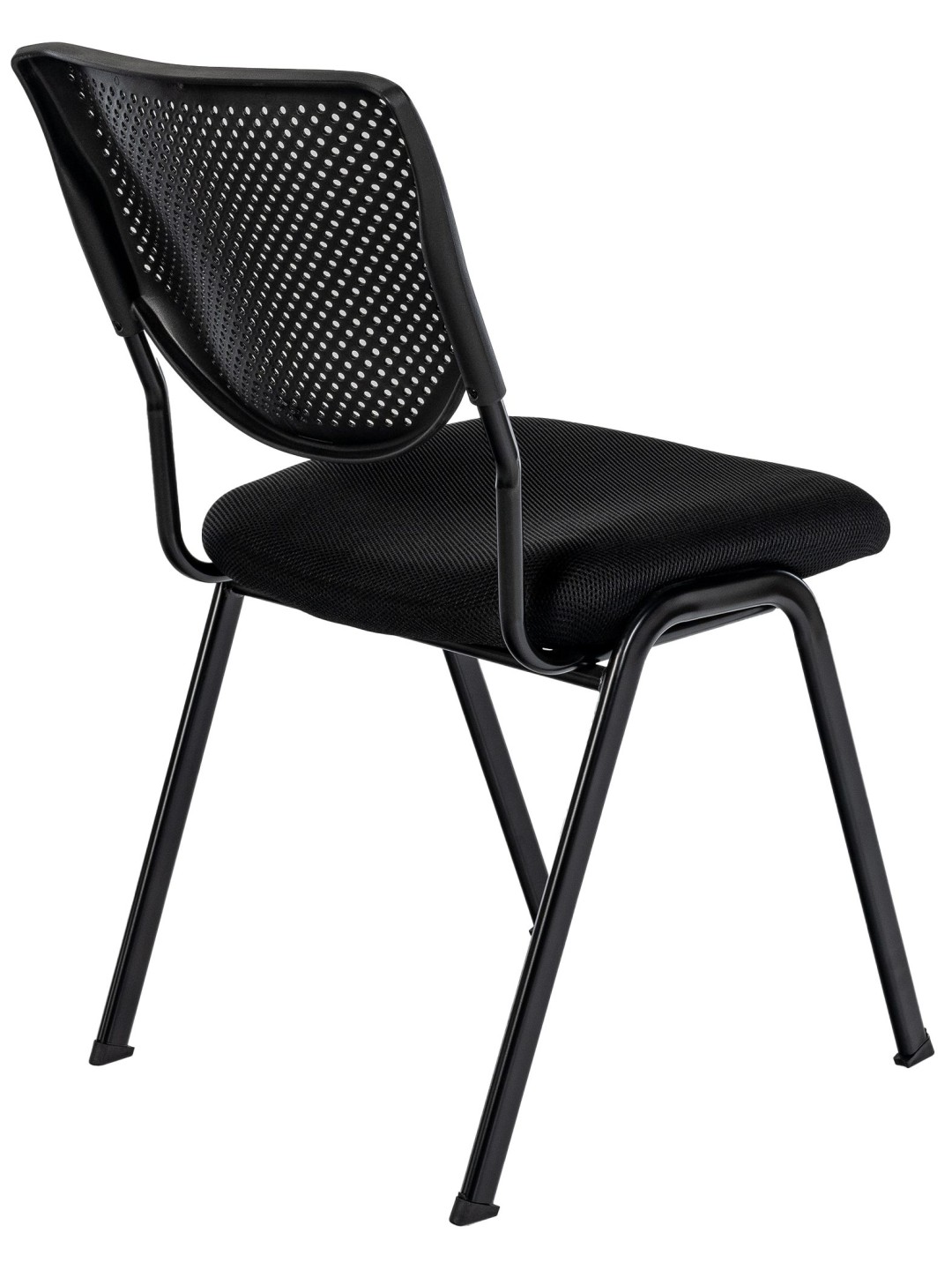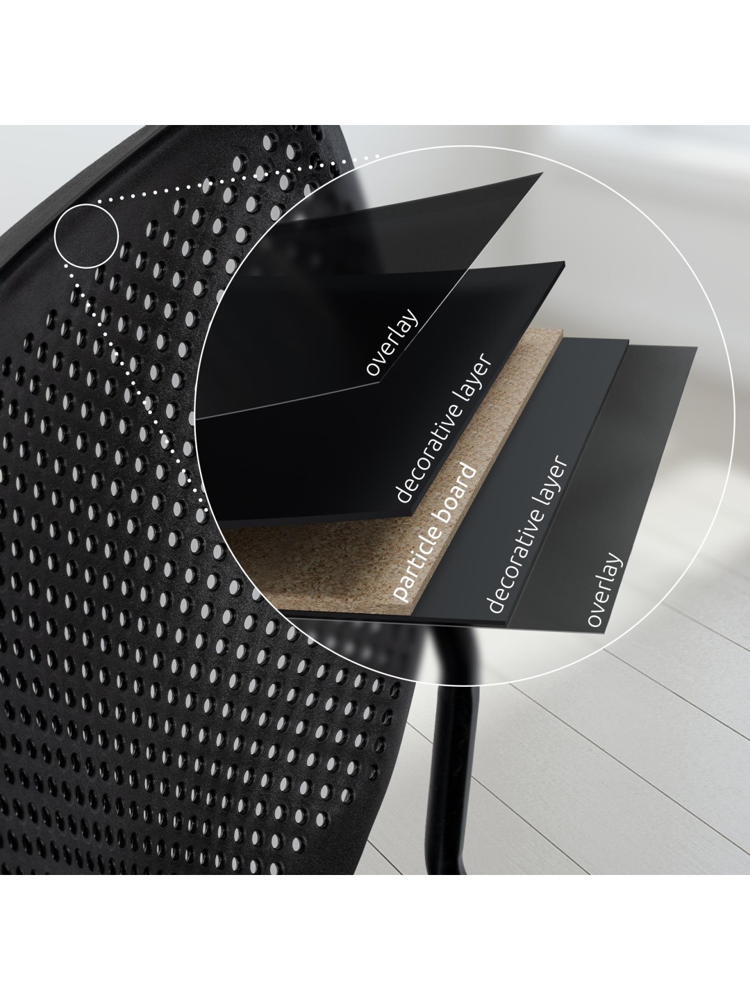 Det polstrede sæde, betrukket med slidstærkt stof, giver sammen med ryglænet en langvarig behagelig siddeoplevelse. Ryglænet har en HPL overflade, et hårdt og tæt byggemateriale. Dette gør ryglænet ubrydeligt og nemt at pleje. Takket være det sorte firbenede stel i metal er stolen stabil og stabil.