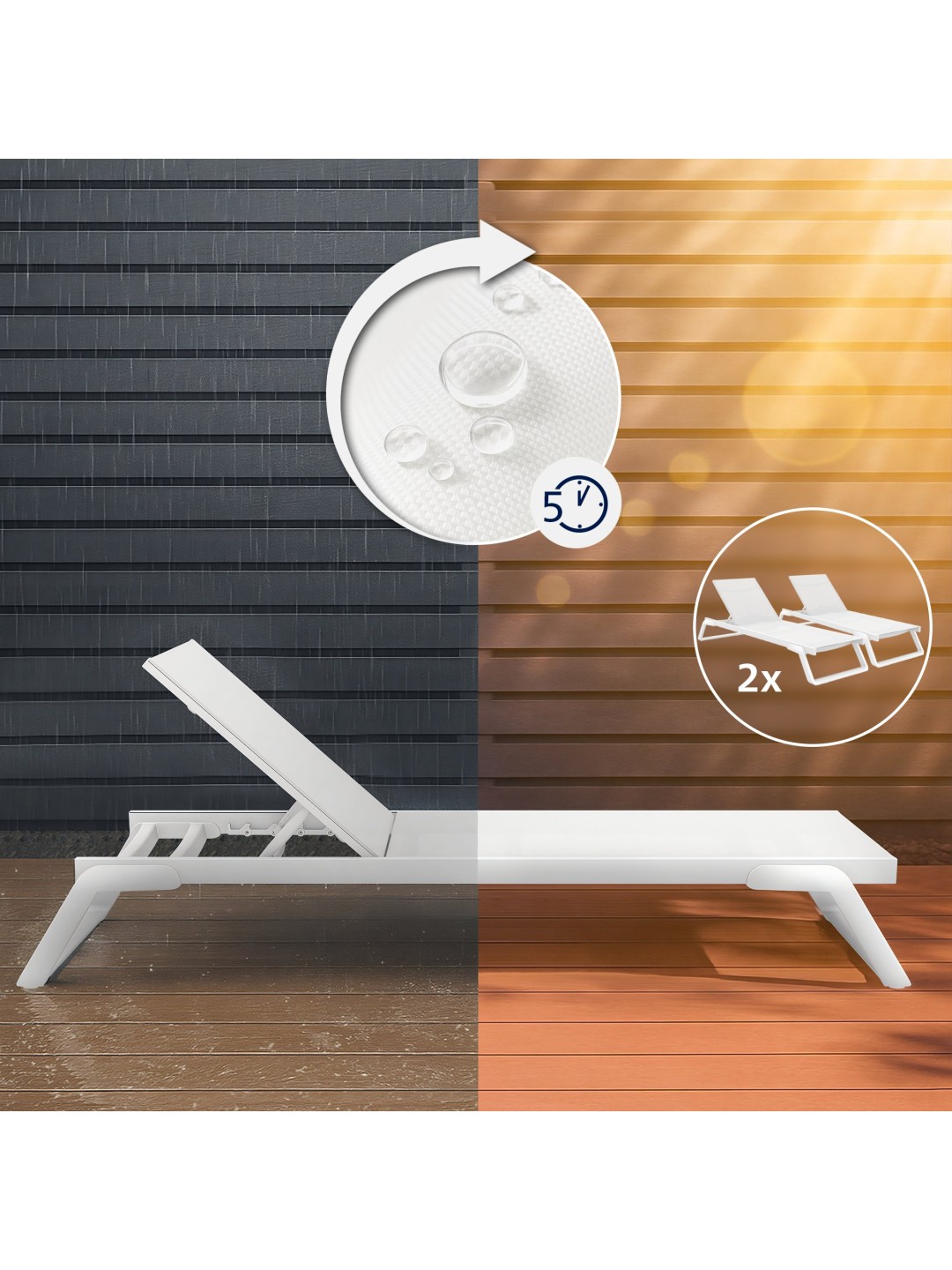 De elegante rammer er lavet af glasfiberforstærket plast (GRP), som sikrer særlig stabilitet og vejrbestandighed. De åndbare liggeflader af syntetisk tekstilstof er UV-bestandige, vandafvisende og kan udskiftes ved behov. Begge liggestole har et 5-vejs justerbart ryglæn, så individuelle sidde- og liggestillinger let er mulige - uanset om det er til solbadning, læsning eller afslapning.