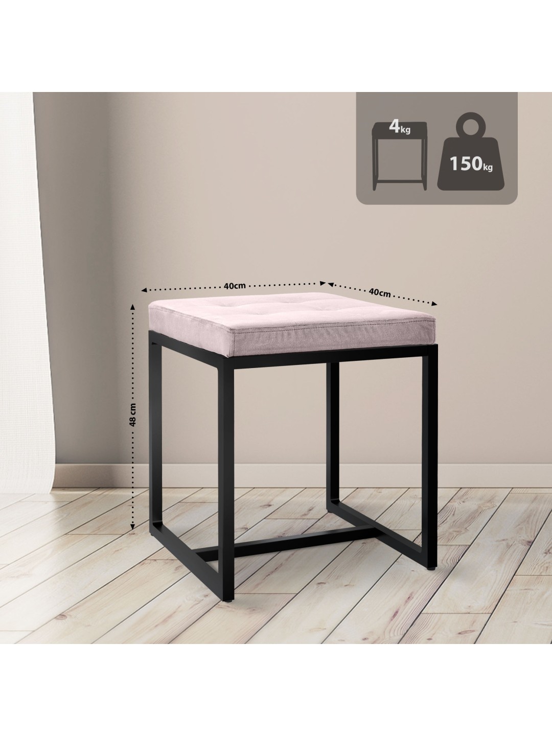 Jernskamlens stel kan holde op til 150 kg og tilbyder en høj grad af stabilitet takket være fire robuste taburetben. Taburettens kompakte størrelse giver mulighed for fleksibel placering i næsten ethvert rum og er især fordelagtig til små opholdsarealer og smalle rum.