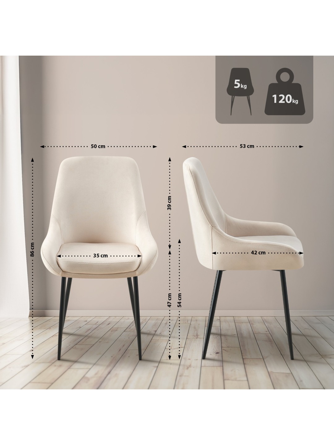 Oplev en stilfuld og behagelig siddeoplevelse med Elmira spisestuestolen. Den moderne spisestuestol er den perfekte tilføjelse til enhver spisestue, takket være dens elegante design lavet af højkvalitets fløjl. Det solide håndværk og robuste konstruktion kendetegner Elmira stolen, som kan holde op til 150 kg. Med en fast sædehøjde på 47 cm og et polstret sæde giver den optimal komfort i længere tid ad gangen.