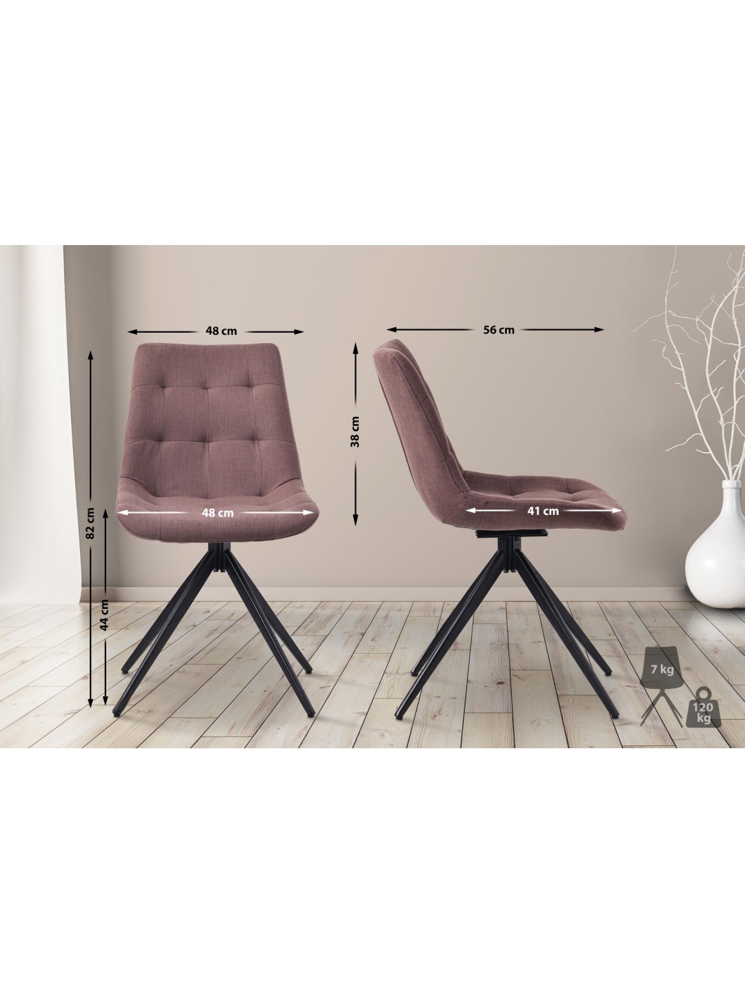 Fundamentet for denne køkkenstol er det matsorte firbenede stel af pulverlakeret metal. Merna spisestuestolen kan belastes med op til 120 kg uden tøven. Gulvbeskyttere forhindrer følsomme gulve i at blive beskadiget.
