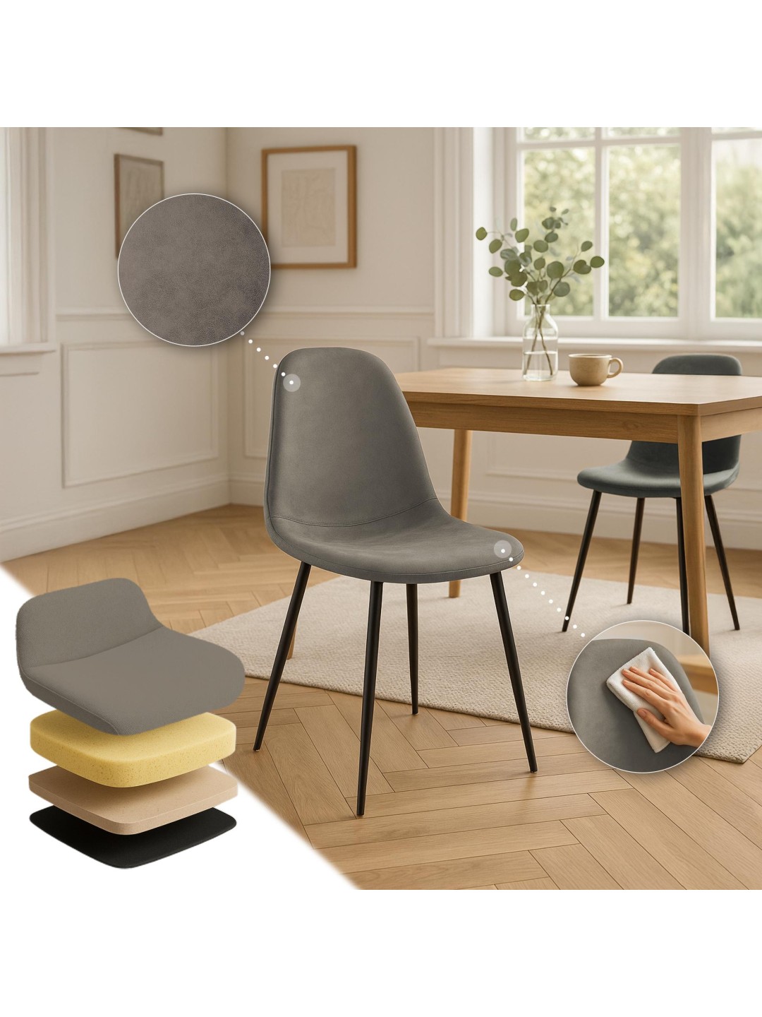 Fundamentet for denne spisestuestol er det stabile firbenede stel lavet af sort, pulverlakeret metal. Det betyder, at Napier stolen sikkert kan belastes med op til 150 kilo. Gulvbeskyttere forhindrer skader på følsomme gulve.