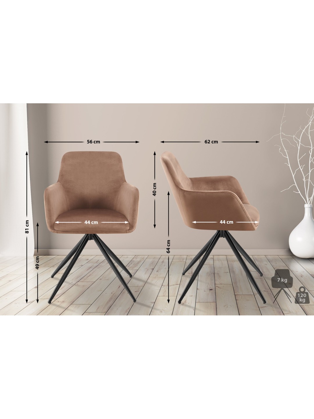 Nøglen til et behageligt sæde er den behagelige polstring over sæde, ryglæn og armlæn. Sædeskallen er beklædt med et elegant fløjlsbetræk. Den såkaldte drejefunktion sikrer, at sædet kan drejes 180 grader, hvilket giver ekstra bevægelsesfrihed.