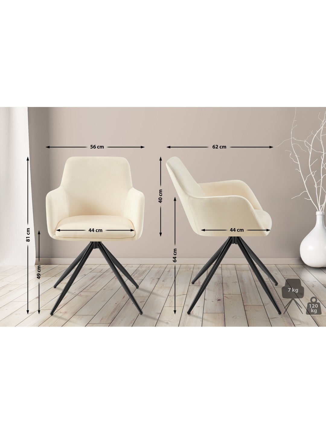 Nøglen til et behageligt sæde er den behagelige polstring over sæde, ryglæn og armlæn. Sædeskallen er beklædt med et elegant fløjlsbetræk. Den såkaldte drejefunktion sikrer, at sædet kan drejes 180 grader, hvilket giver ekstra bevægelsesfrihed.